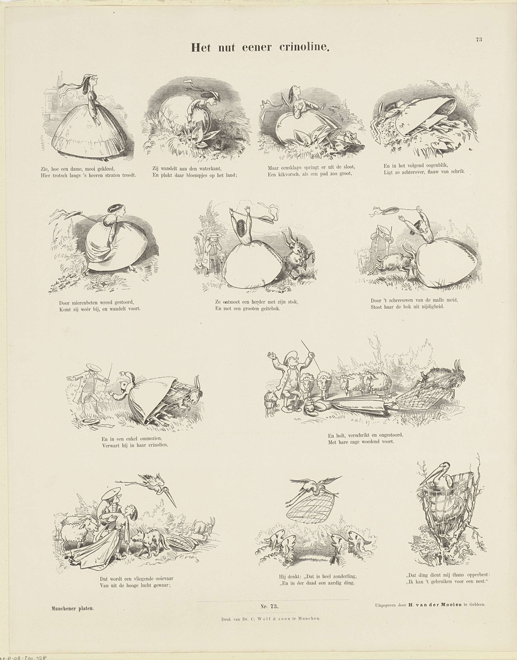 Blad met 12 voorstellingen over een fraaie jurk met crinoline die als ooievaarsnest eindigt. Onder elke afbeelding een tweeregelig vers. Genummerd midden onder: Nro. 73. Genummerd rechtsboven: 73.