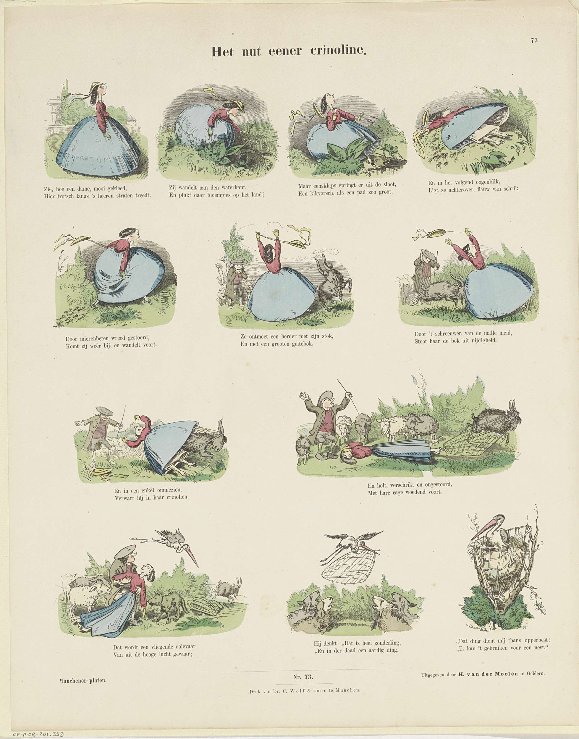 Blad met 12 voorstellingen over een fraaie jurk met crinoline die als ooievaarsnest eindigt. Onder elke afbeelding een tweeregelig vers. Genummerd midden onder: Nro. 73. Genummerd rechtsboven: 73.