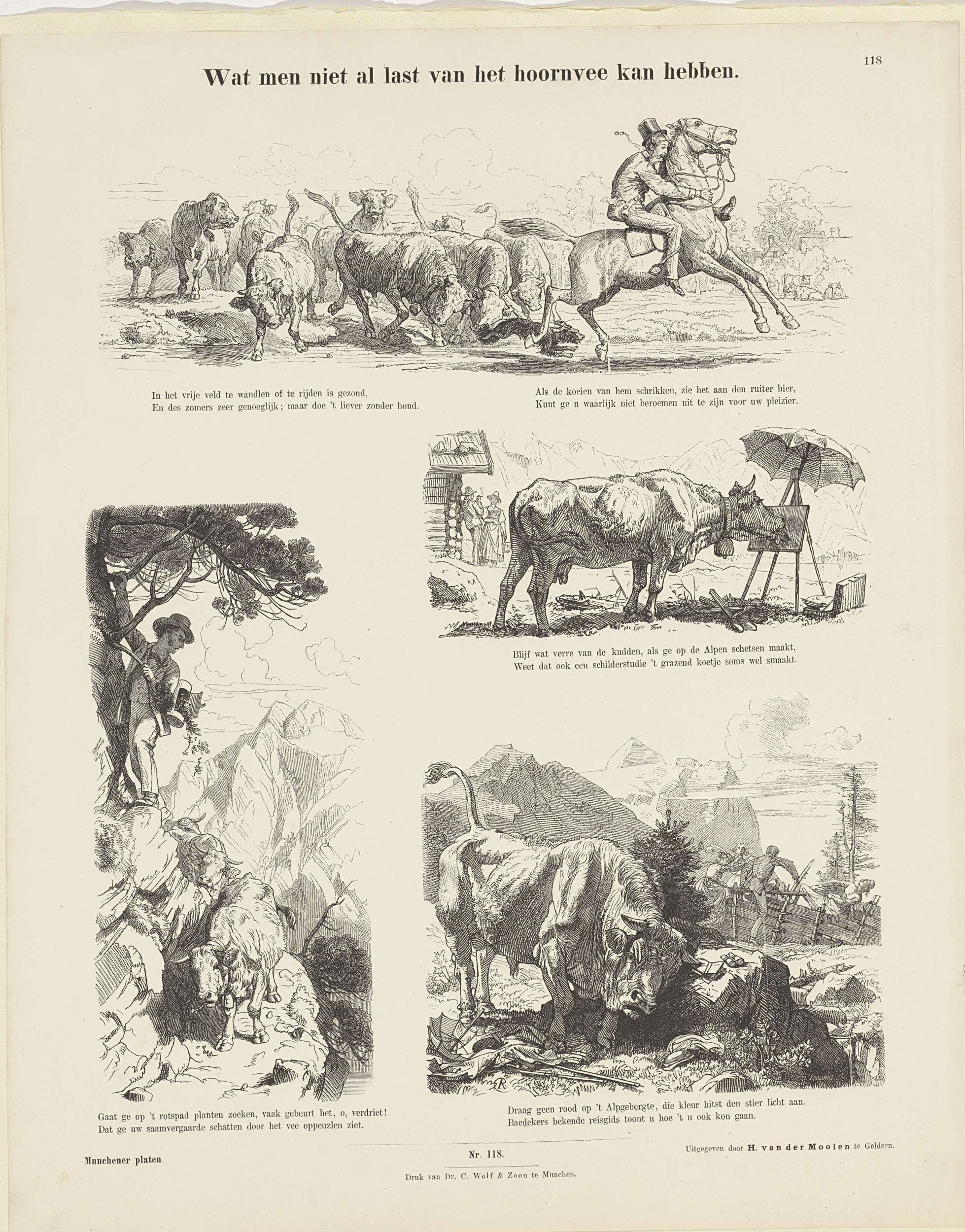 Blad met 4 voorstellingen van koeien en ossen die problemen veroorzaken. Onder elke afbeelding een onderschrift. Genummerd midden onder: Nro. 118. Genummerd rechtsboven: 118.