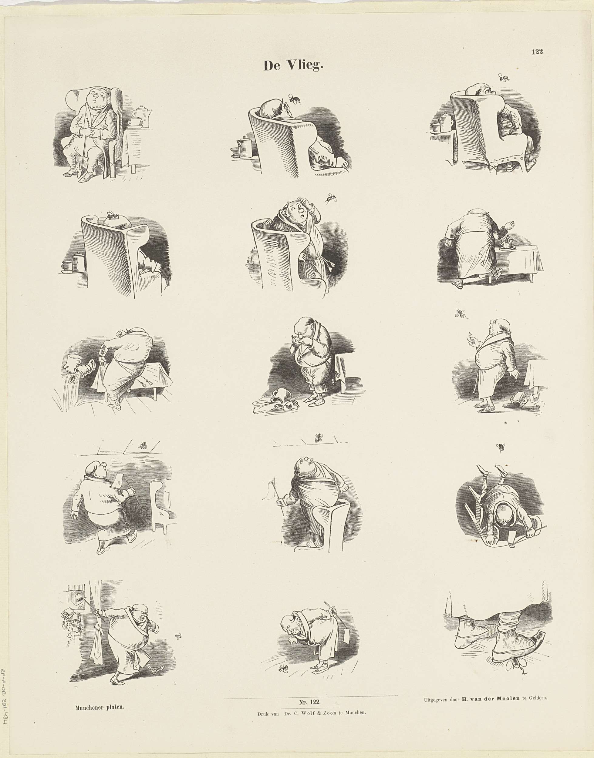 Blad met 15 voorstellingen over een man dier er na veel moeite in slaagt een irritante vlieg (wesp?) te vangen. Genummerd midden onder: Nro. 122. Genummerd rechtsboven: 122.