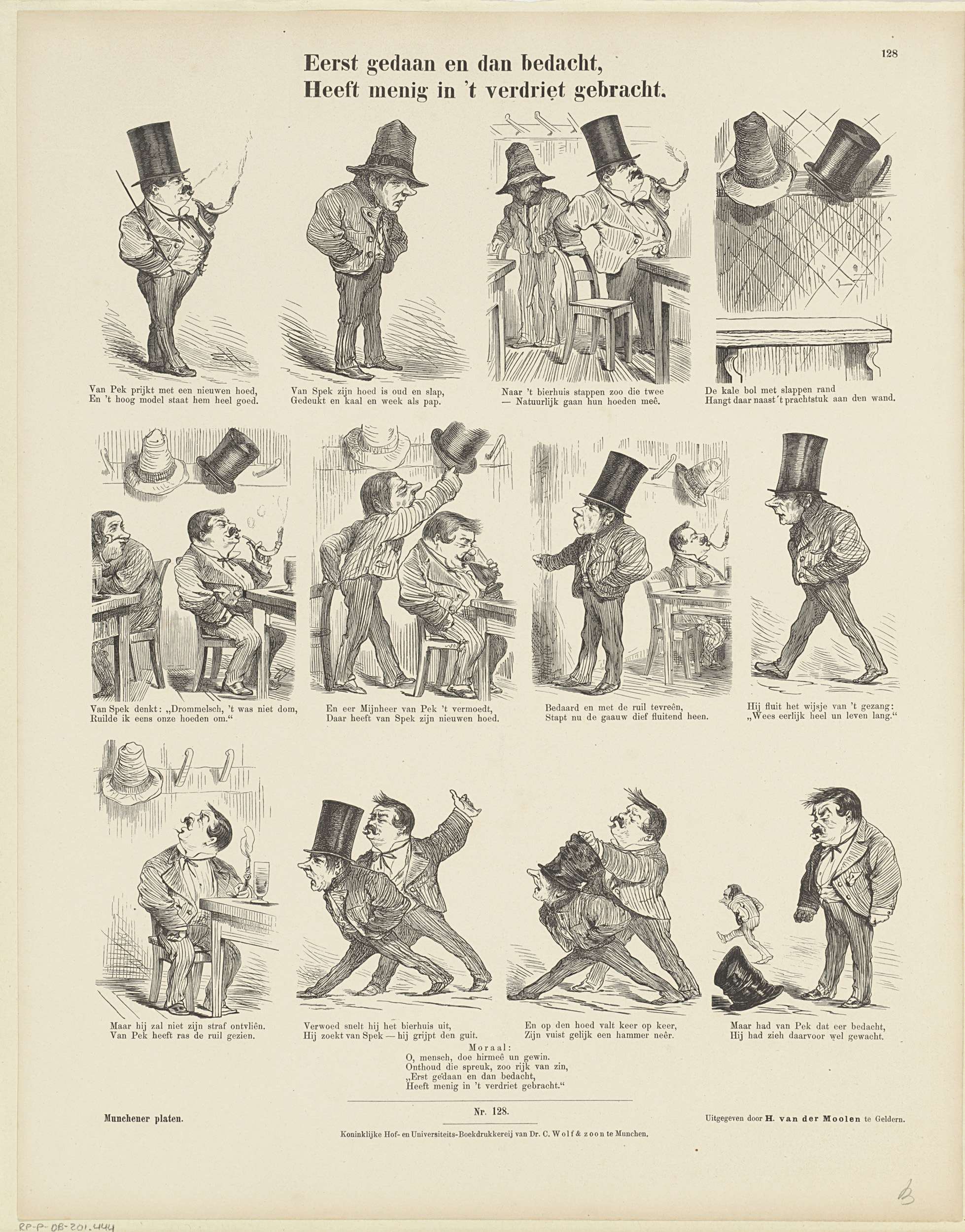 Blad met 12 voorstellingen over meneer Van Spek die de hoed steelt van meneer Van Pek. Onder elke afbeelding een tweeregelig vers. In de ondermarge een vierregelig vers. Genummerd midden onder: Nro. 128. Genummerd rechtsboven: 128.