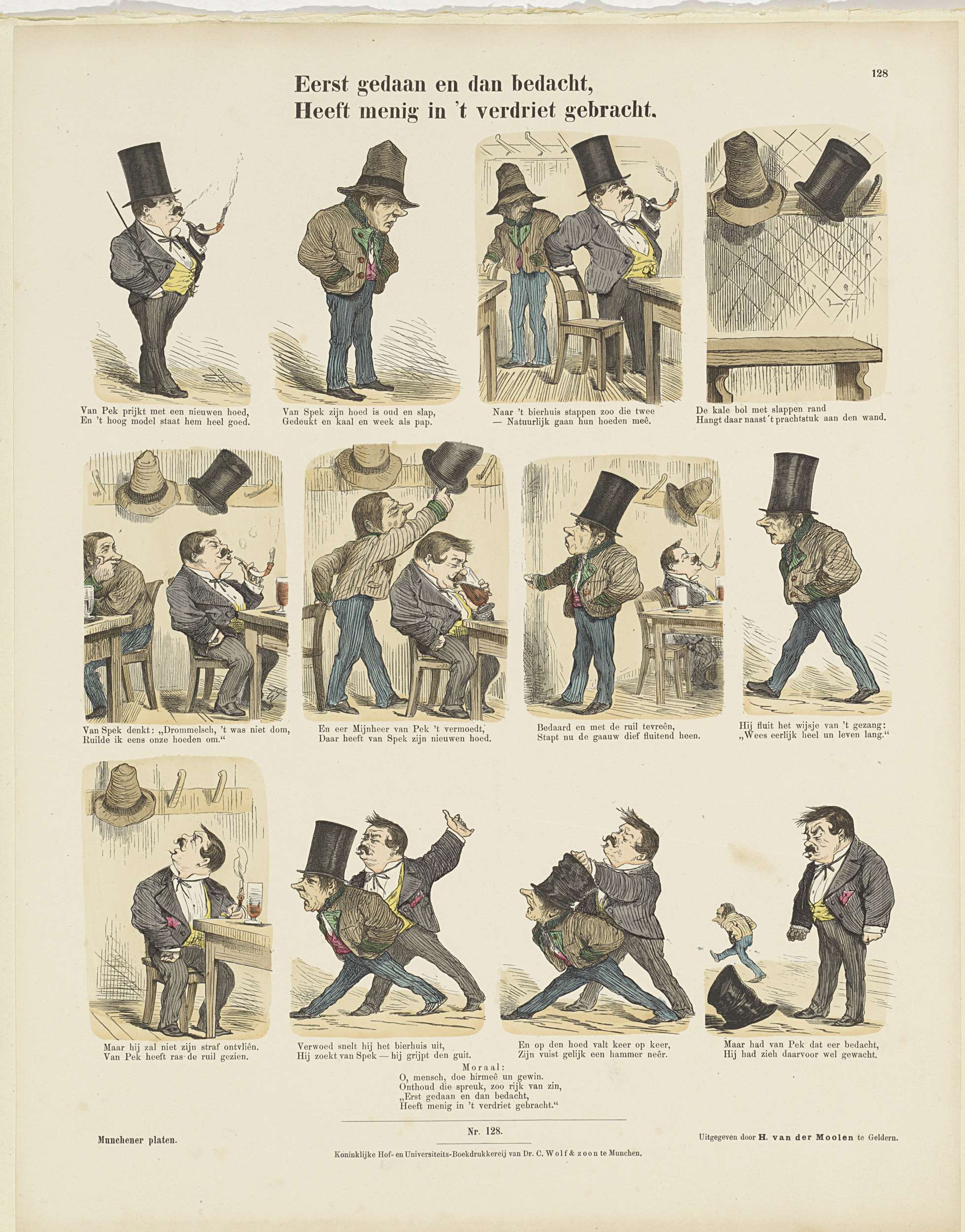 Blad met 12 voorstellingen over meneer Van Spek die de hoed steelt van meneer Van Pek. Onder elke afbeelding een tweeregelig vers. In de ondermarge een vierregelig vers. Genummerd midden onder: Nro. 128. Genummerd rechtsboven: 128.
