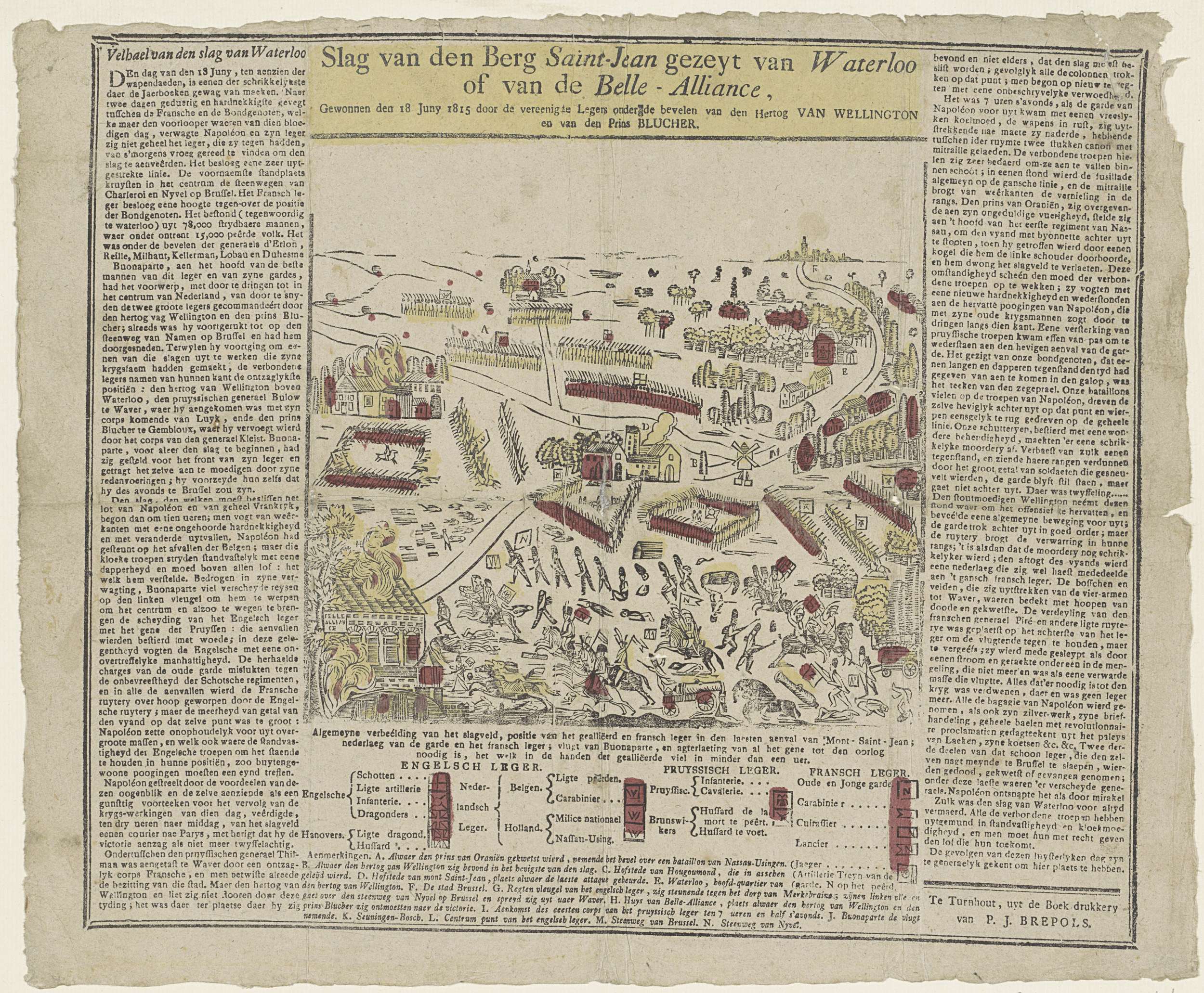 Slag van den berg Saint-Jean gezeyt van Waterloo / of van de Belle-Alliance, / gewonnen den 18 Juny 1815 door de vereenigde Legers onder de bevelen van den hertog van Wellington / en van den prins Blucher
