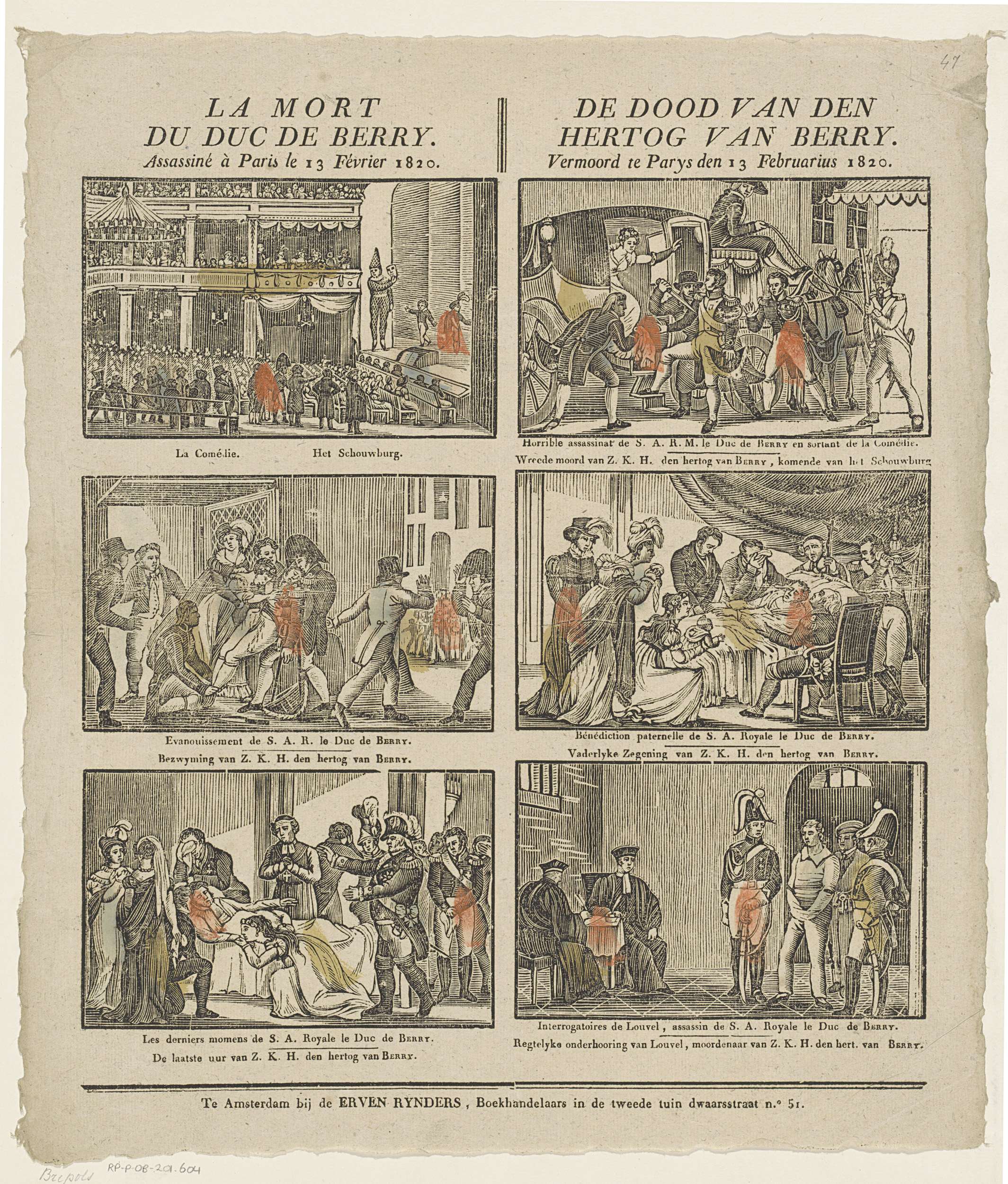 Blad met 6 voorstellingen over de moord op Karel Ferdinand van Berry op 13 februari 1820 te Parijs. Onder elke voorstelling een onderschrift in het nederlands en het Frans.