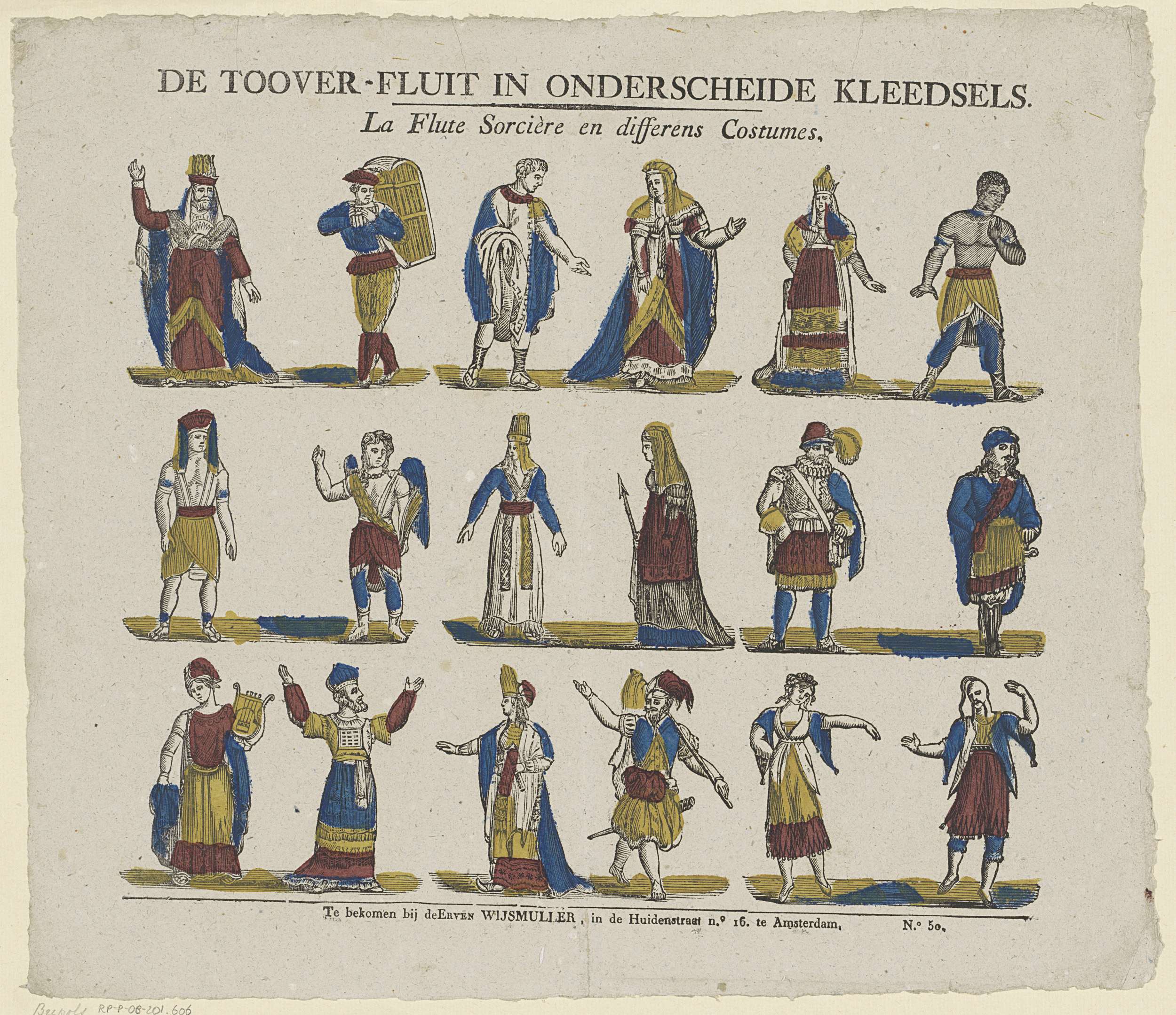 Blad met 3 horizontale rijen met elk zes personages uit de opera de Toverfluit (Die Zauberflöte) op een rij. Genummerd rechtsonder: No. 50.