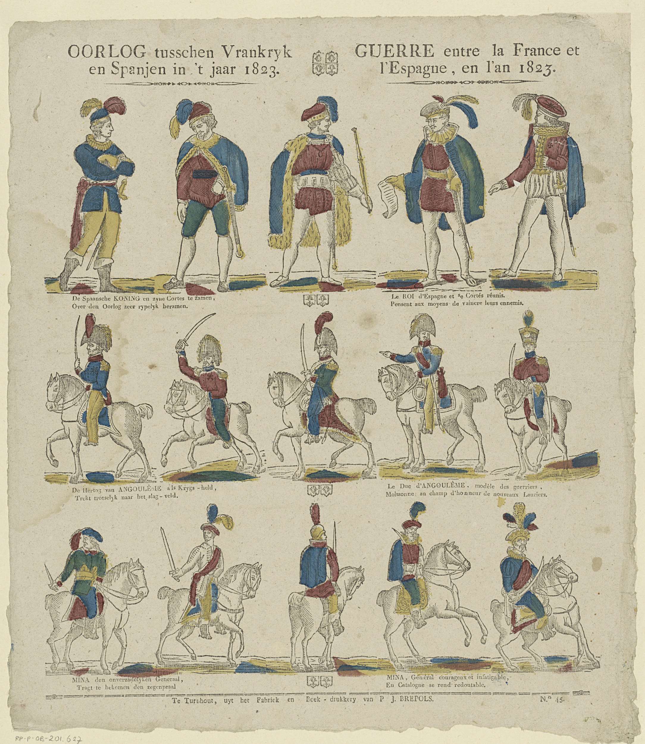 Blad met 3 horizontale rijen met voorstellingen van figuren uit de oorlog tussen Spanje en Frankrijk in 1823. Boven: de Spaanse koning met zijn generaals. Midden: de Hertog van Angoulême met zijn soldaten te paard. Onder: generaal Midas met zijn soldaten te paard. Onder elke voorstelling een tweeregelig vers in het Nederlands en in het ...