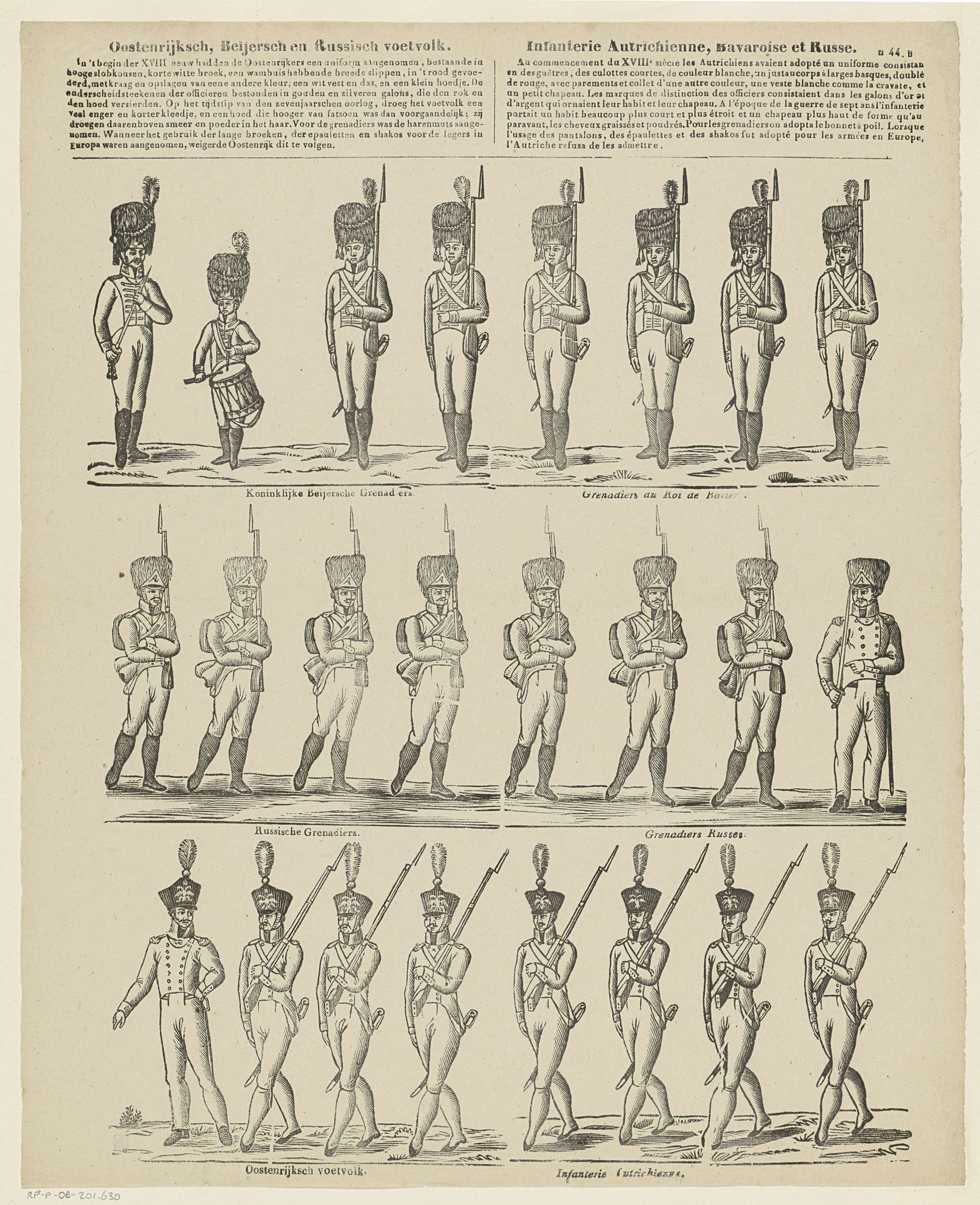 Blad met 3 horizontale rijen met elk acht militairen op een rij. Op de bovenste rij Beierse soldaten, op de middelste rij Russische soldaten en op de onderste rij Oorstenrijkse soldaten. Onder elke voorstelling een onderschrift in het Nederlands en in het Frans. Een achtienregelig bovenschrift bovenschrift in twee kolommen in het Nederlands en in ...
