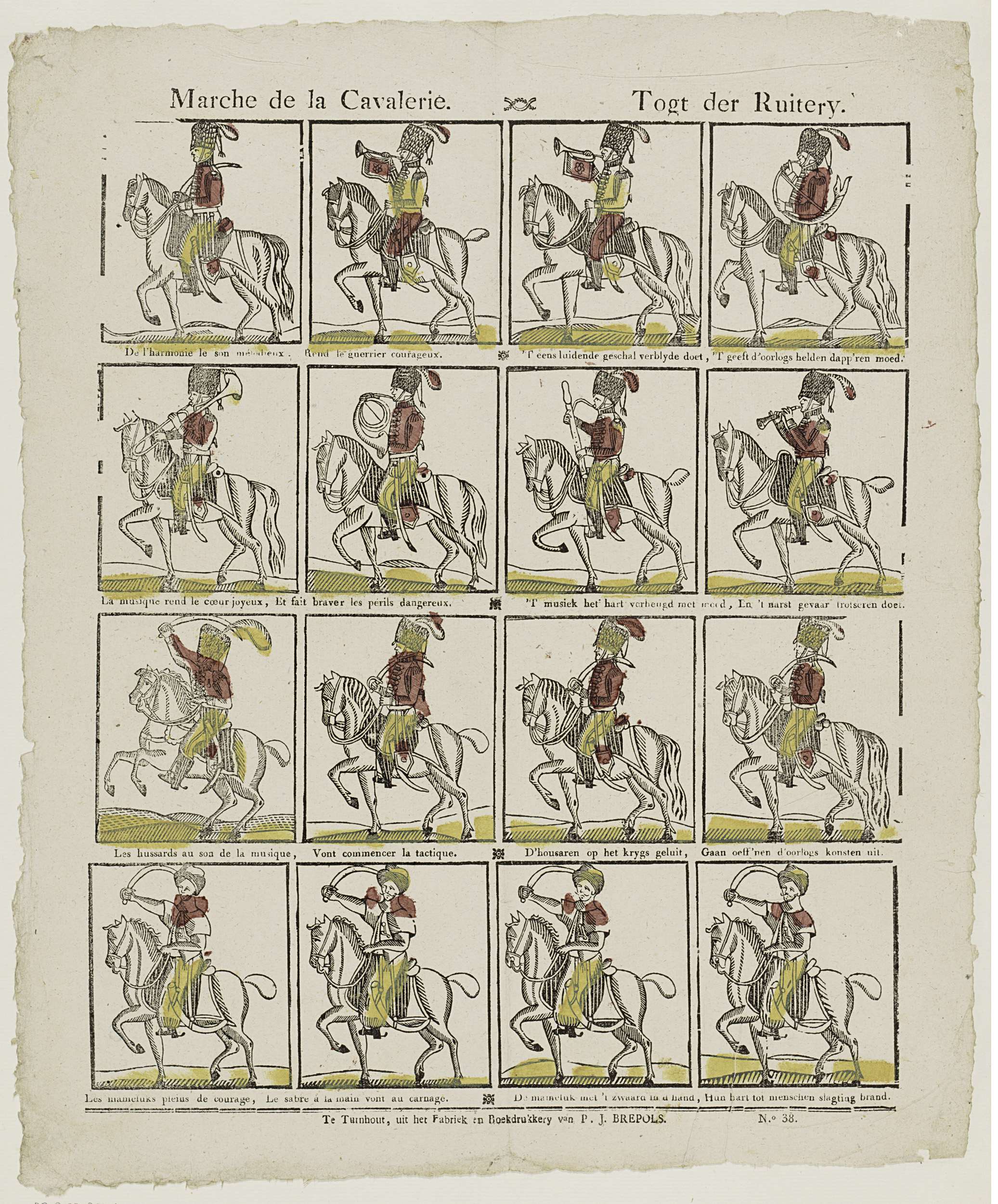 Blad met 16 voorstellingen van militairen te paard. Onder elke afbeelding een onderschrift in het Nederlands of in het Frans. Genummerd rechtsonder: No. 38.