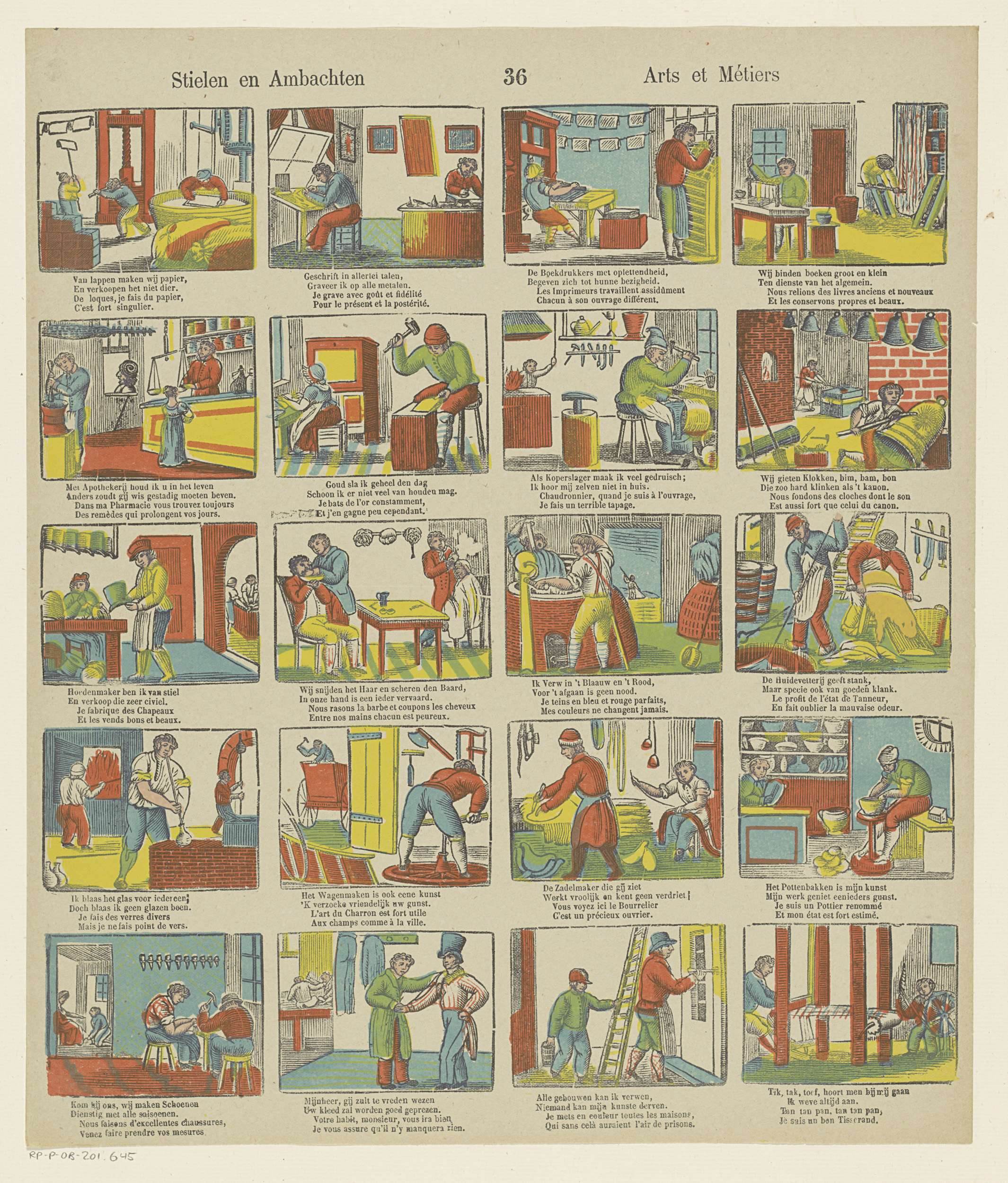 Blad met 20 voorstellingen van ambachtslieden en beroepen, zoals papiermaker, koperslager, barbier en schilder. Onder elke afbeelding een tweeregelig vers in het Nederlands of in het Frans. Genummerd midden boven: 36.