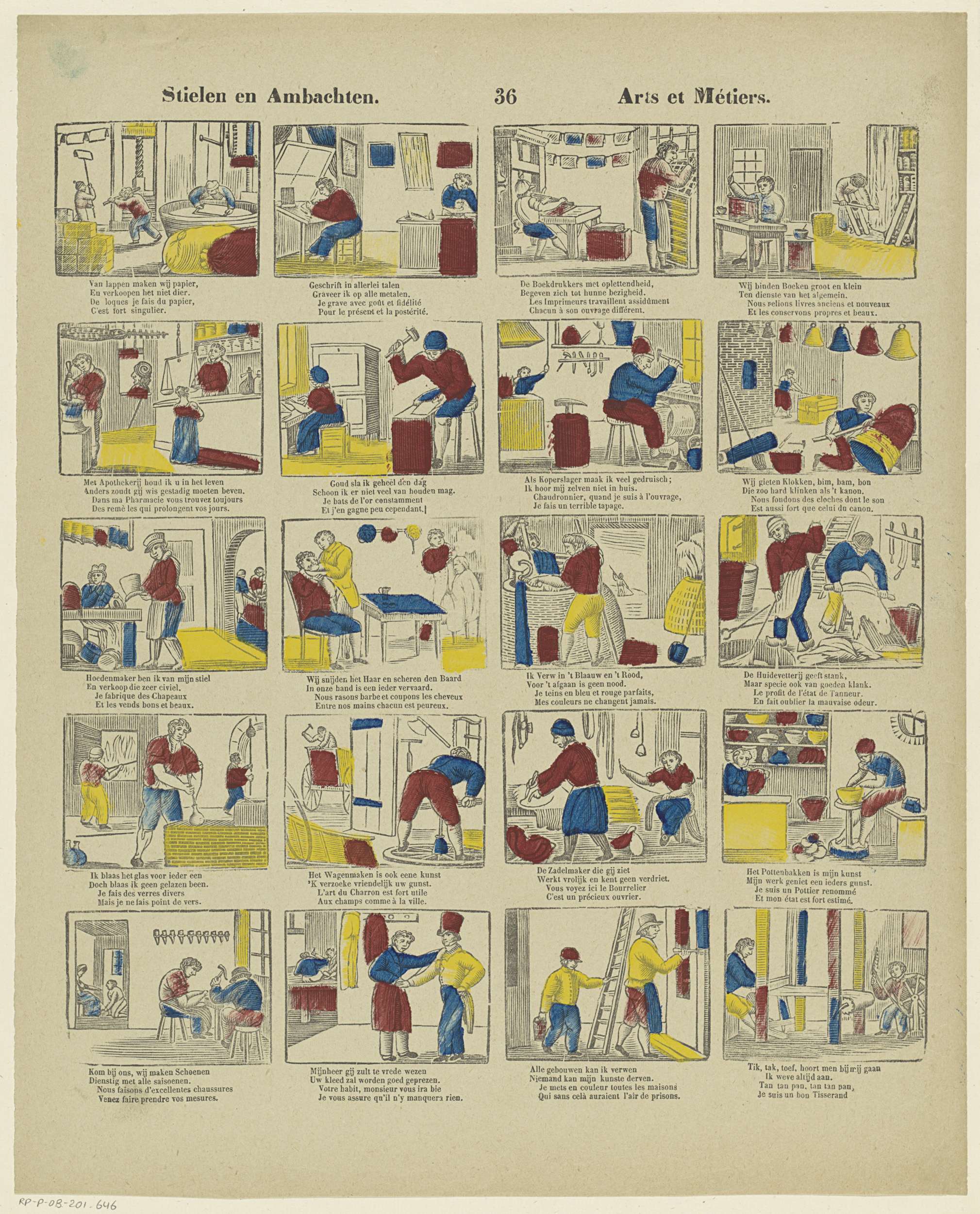 Blad met 20 voorstellingen van ambachtslieden en beroepen, zoals papiermaker, koperslager, barbier en schilder. Onder elke afbeelding een tweeregelig vers in het Nederlands of in het Frans. Genummerd midden boven: 36.