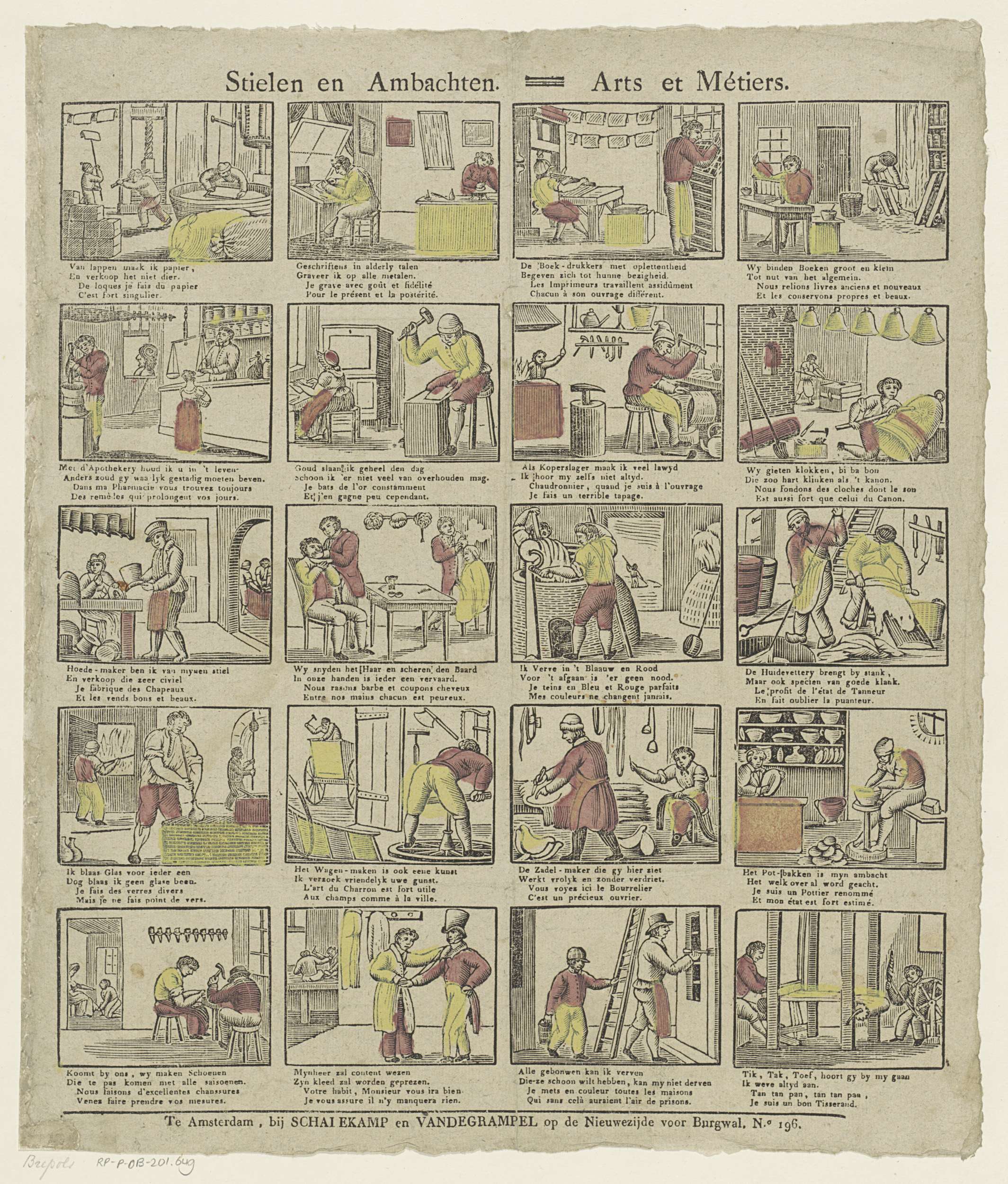 Blad met 20 voorstellingen van ambachtslieden en beroepen, zoals papiermaker, koperslager, barbier en schilder. Onder elke afbeelding een tweeregelig vers in het Nederlands of in het Frans.