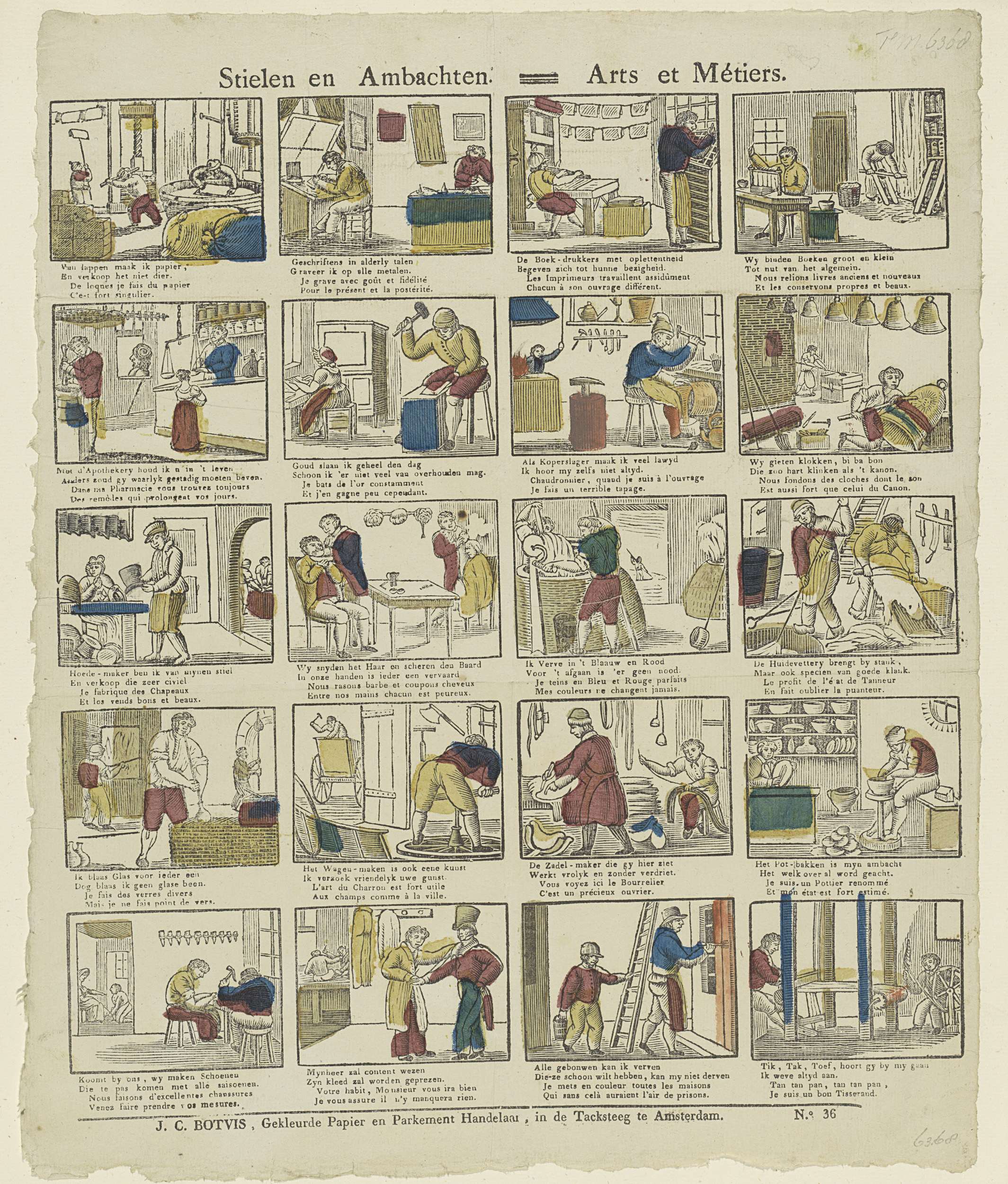 Blad met 20 voorstellingen van ambachtslieden en beroepen, zoals papiermaker, koperslager, barbier en schilder. Onder elke afbeelding een tweeregelig vers in het Nederlands of in het Frans. Genummerd rechtsonder: No. 36.