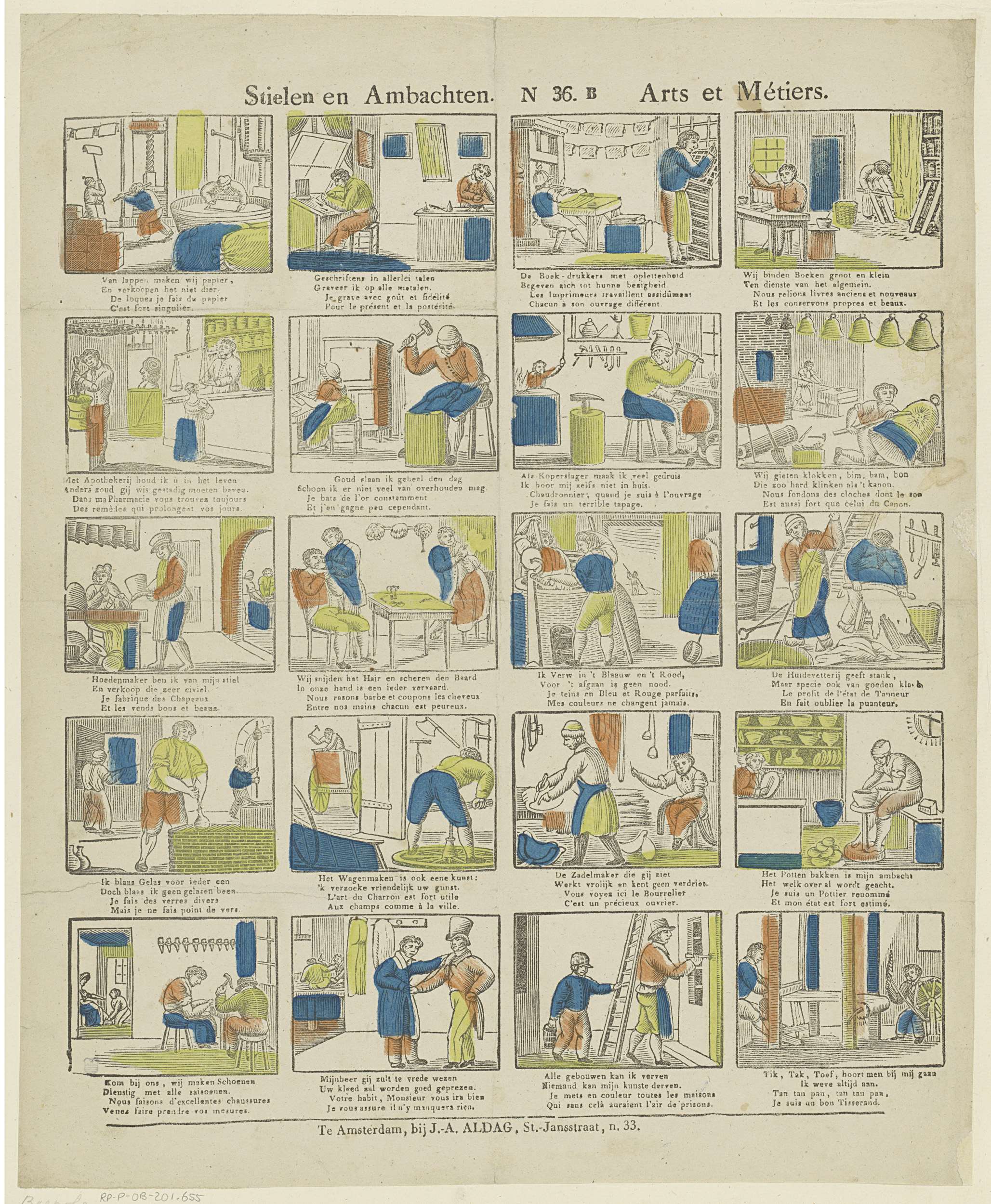 Blad met 20 voorstellingen van ambachtslieden en beroepen, zoals papiermaker, koperslager, barbier en schilder. Onder elke afbeelding een tweeregelig vers in het Nederlands of in het Frans. Genummerd midden boven: N 36. B.