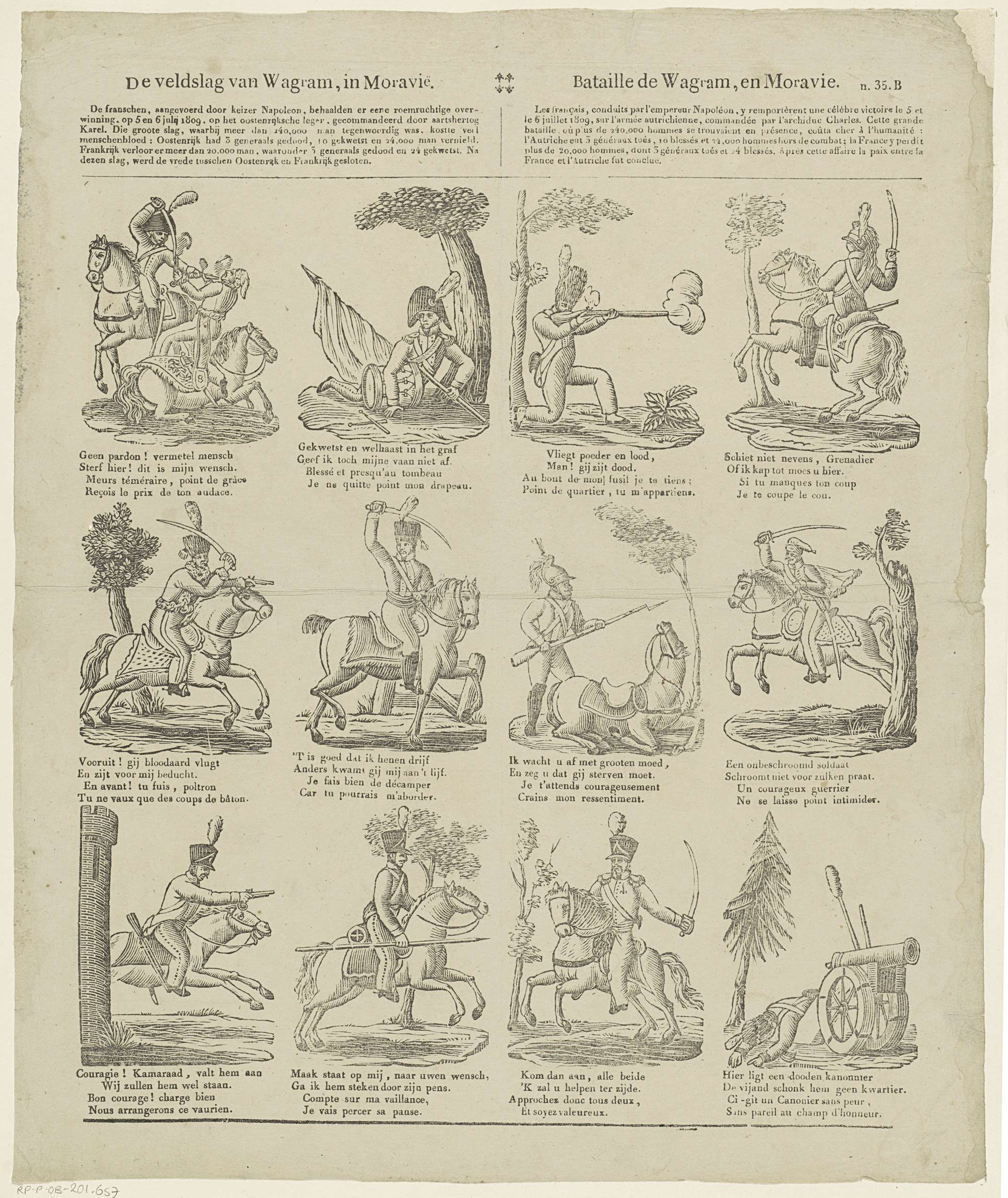 Blad met 12 voorstellingen van vechtende soldaten tijdens de Slag van Wagram. Onder elke afbeelding een tweeregelig vers in het Nederlands of in het Frans, een zesregelig bovenschrift in het Nederlands en in het Frans in twee kolommen. Genummerd rechtsboven: (n. 35. B).