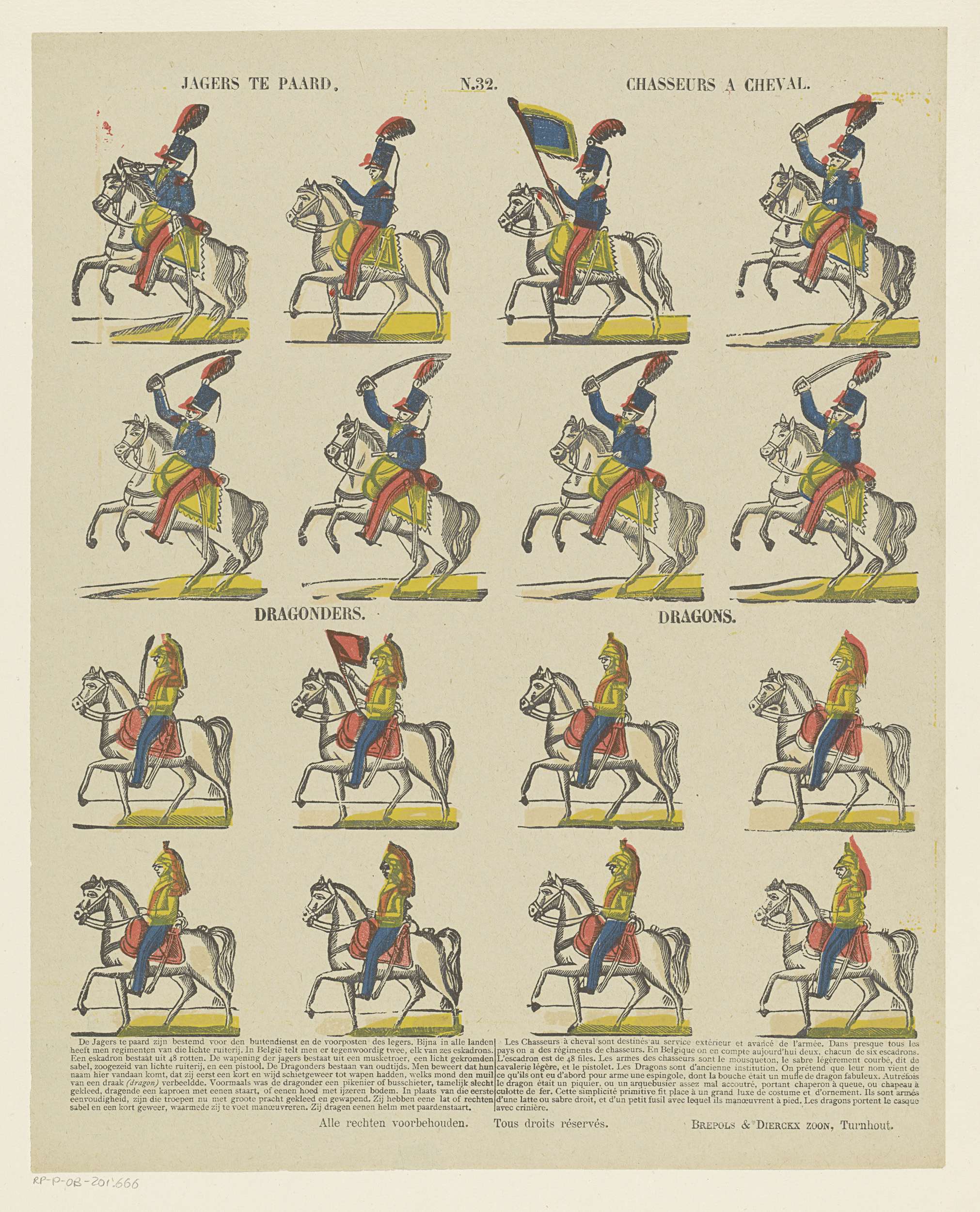 Blad met 16 voorstellingen van militairen te paard. Onder een negenregelig onderschrift in het Nederlands en in het Frans in twee kolommen. Genummerd midden boven: N. 32.