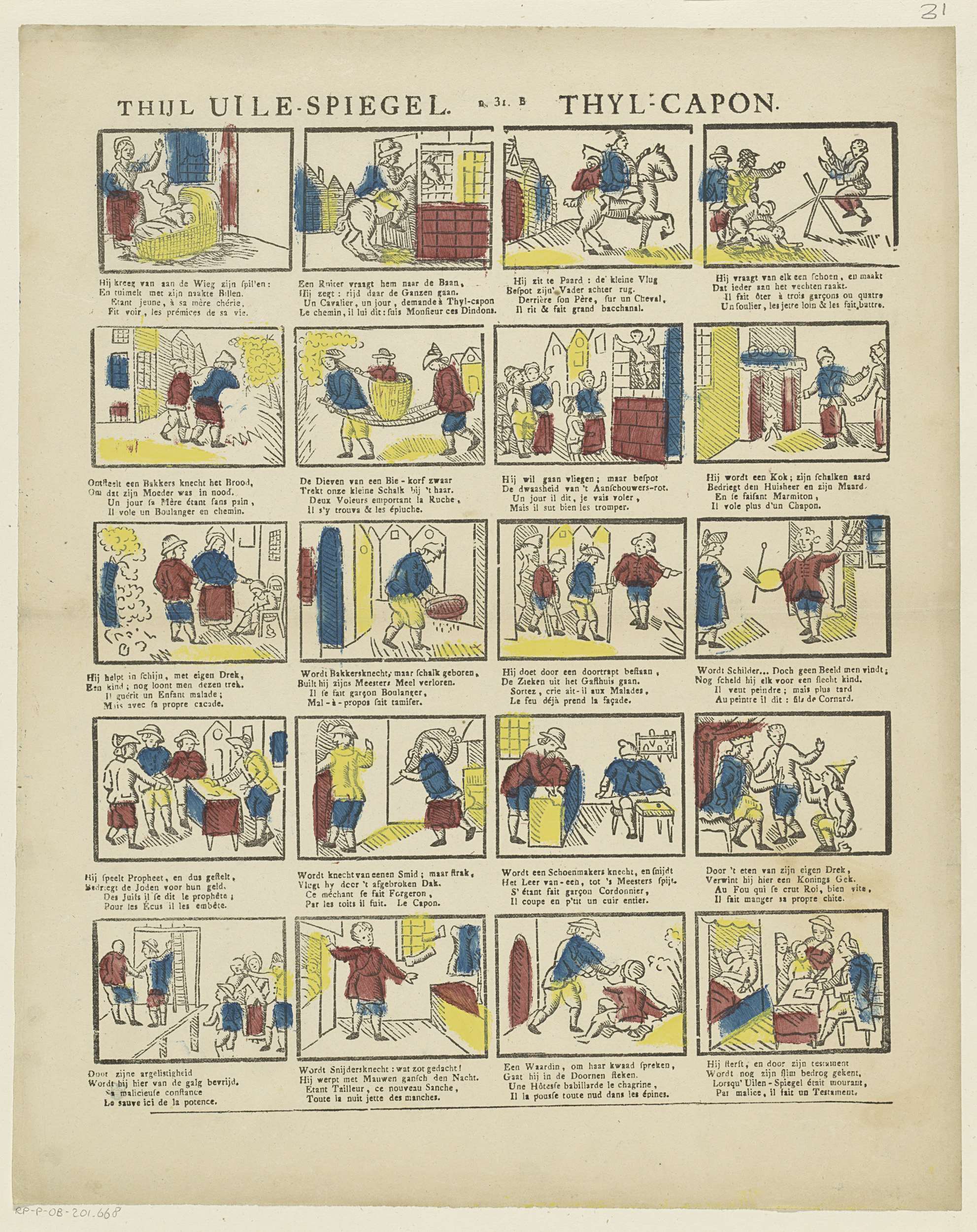Blad met 20 voorstellingen over het leven van Tijl Uilenspiegel. Onder elke afbeelding een tweeregelig vers in het Nederlands en in het Frans. Genummerd midden boven: n. 31. B.