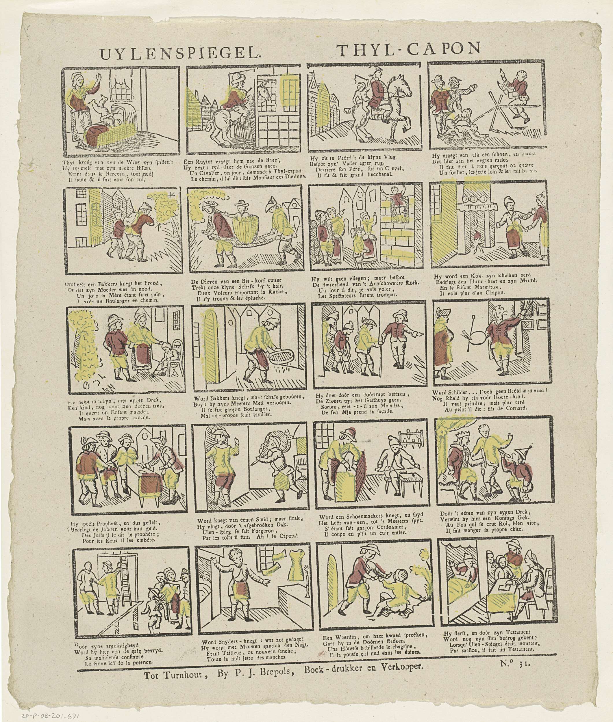 Blad met 20 voorstellingen over het leven van Tijl Uilenspiegel. Onder elke afbeelding een tweeregelig vers in het Nederlands en in het Frans. Genummerd rechtsonder: No. 31.