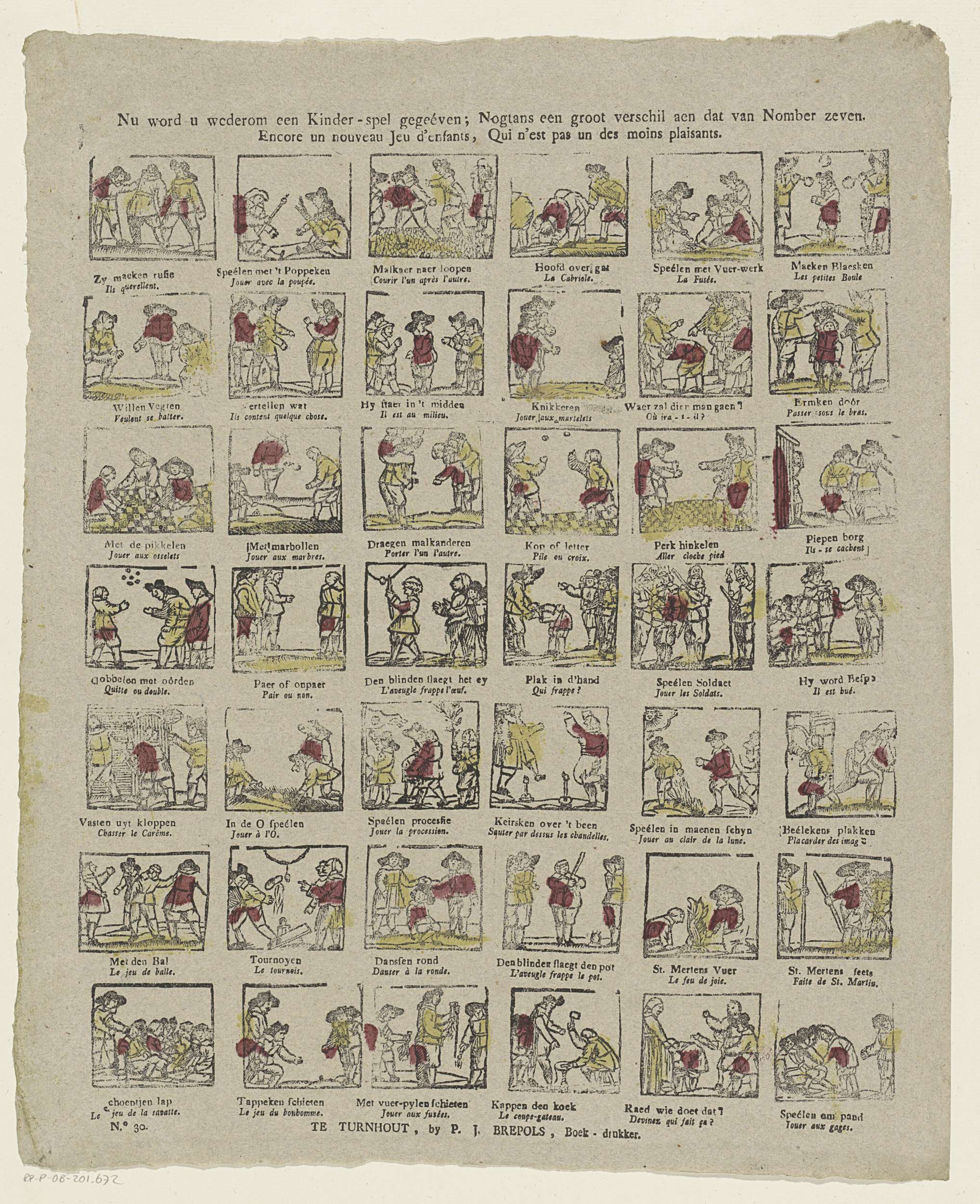 Blad met 42 voorstellingen van kinderspelen, waaronder spelen met vuurwerk, knikkeren, hinkelen, met de bal spelen en dansen. Onder elke afbeelding een onderschrift in het Nederlands en in het Frans. Genummerd linksonder: No. 30.