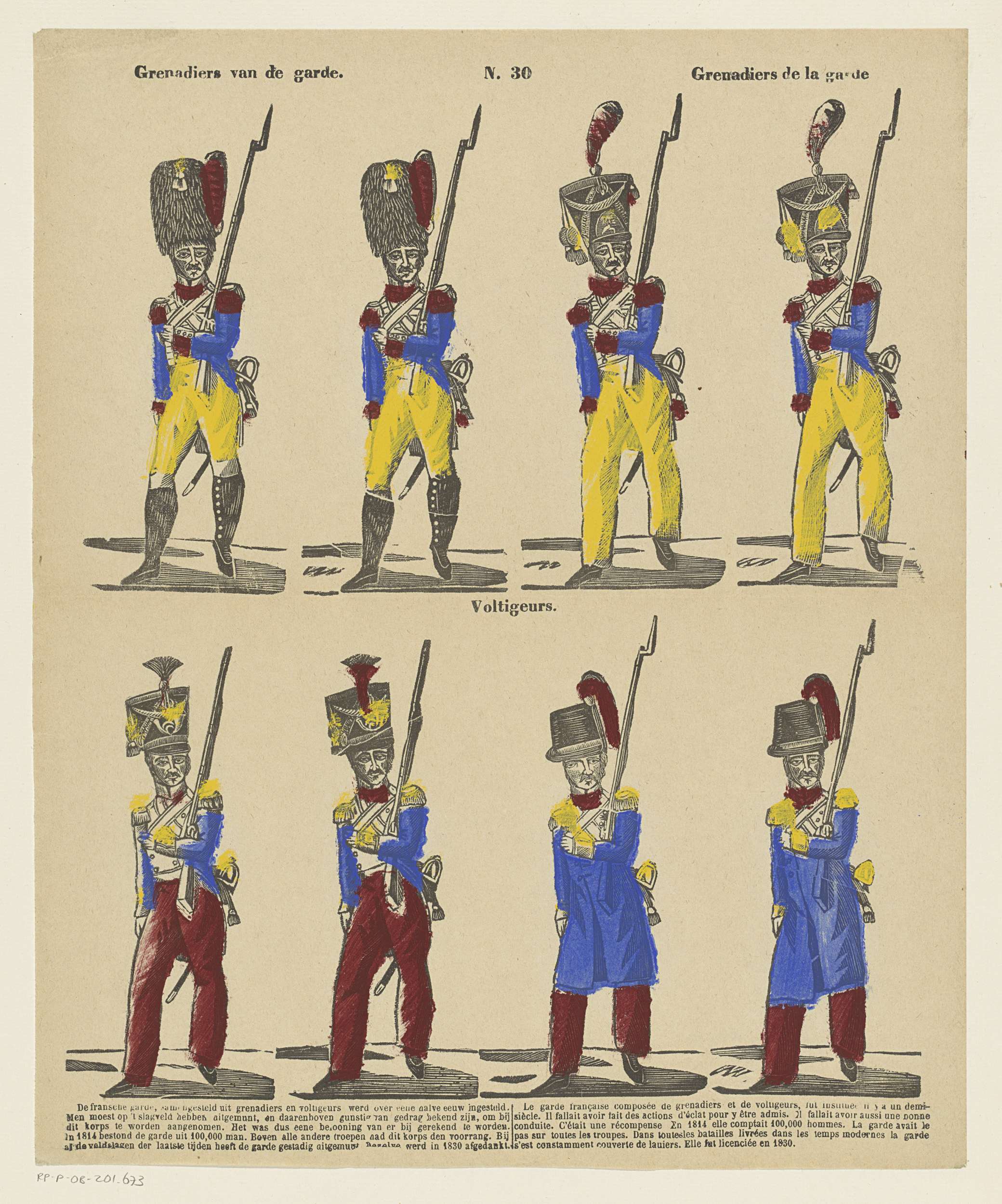 Blad met 2 horizontale rijen met voorstellingen van militairen. in de ondermarge een vijfregelig onderschrift in het Nederlands en in het Frans in twee kolommen. Genummerd midden boven: N. 30.