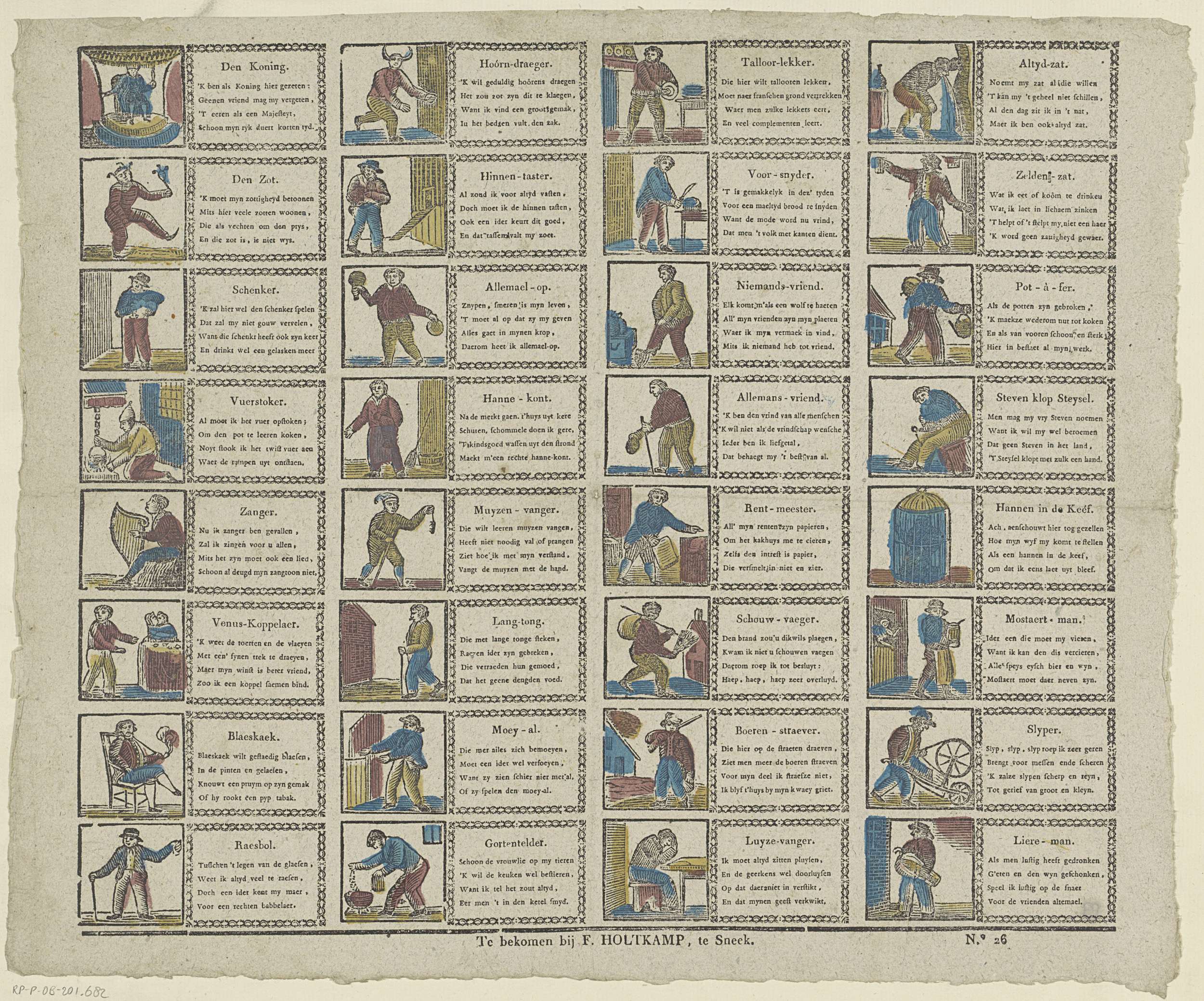 Blad met 32 voorstellingen (driekoningenbriefjes) van verschillende functies binnen het hof, waaronder de koning, de zot, de vuurstoker en de zanger. Rechts naast elke afbeelding een vierregelig vers. Genummerd rechtsonder: No. 26.