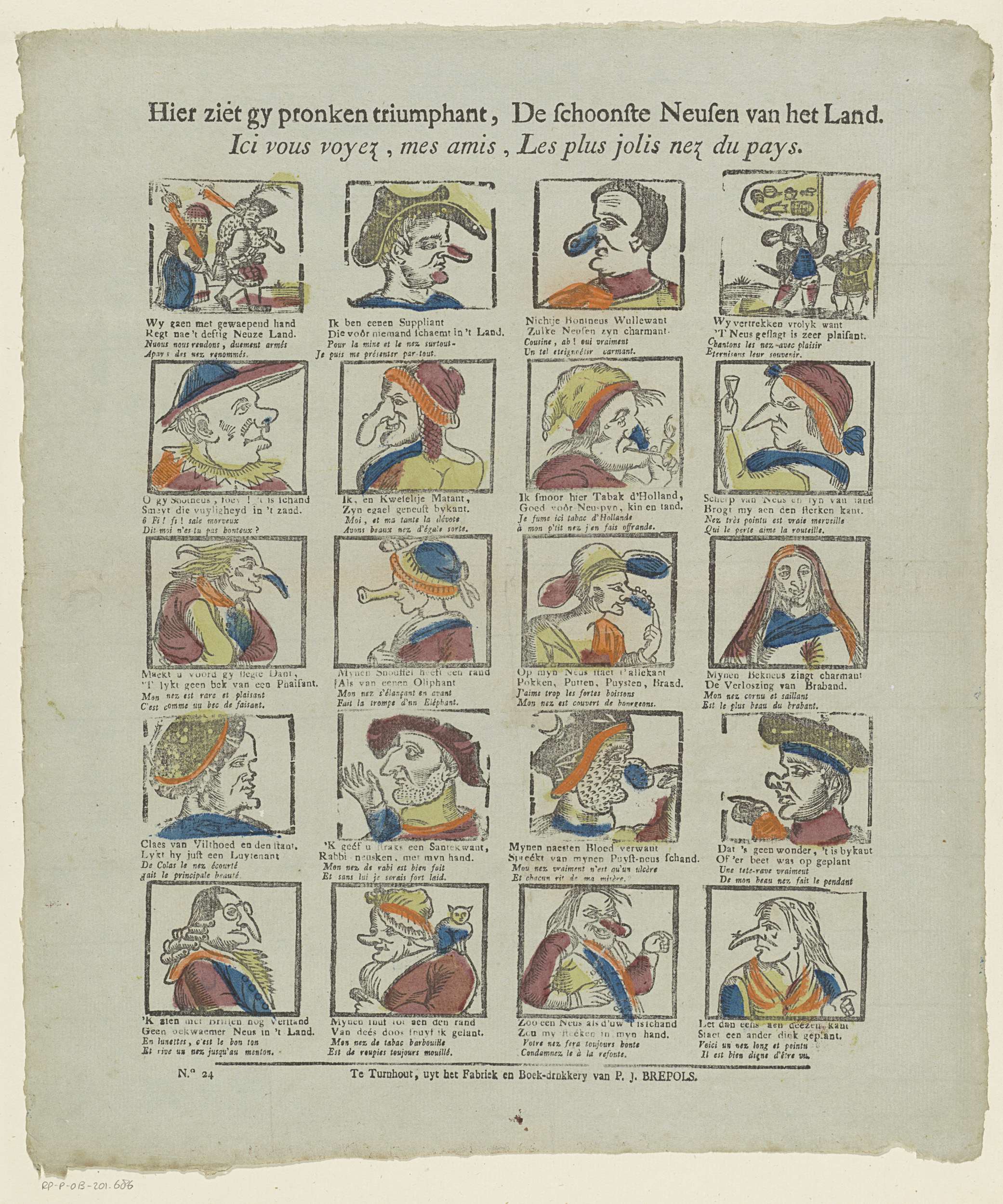 Blad met 20 komische voorstellingen van figuren met grote en misvormde neuzen. Onder elke voorstelling een tweeregelig vers in het Nederlands en het Frans. Genummerd linksonder: No. 24.