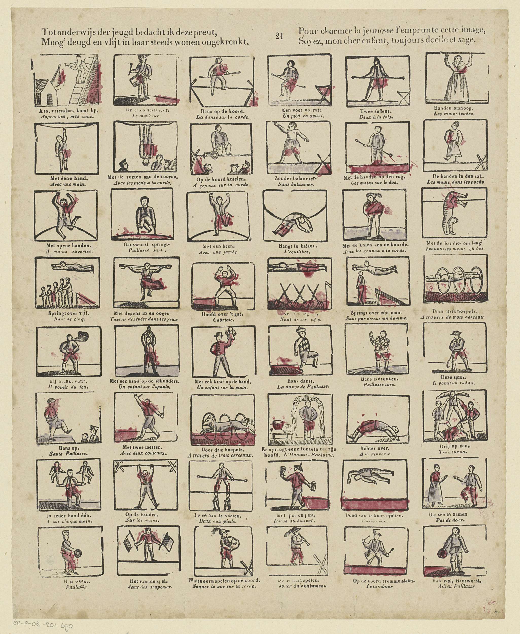 Blad met 48 voorstellingen van artiesten en kunstenmakers, waaronder koorddansers, acrobaten en dansers. Onder elke afbeelding een onderschrift in het Nederlands en in het Frans. Genummerd midden boven: 21.
