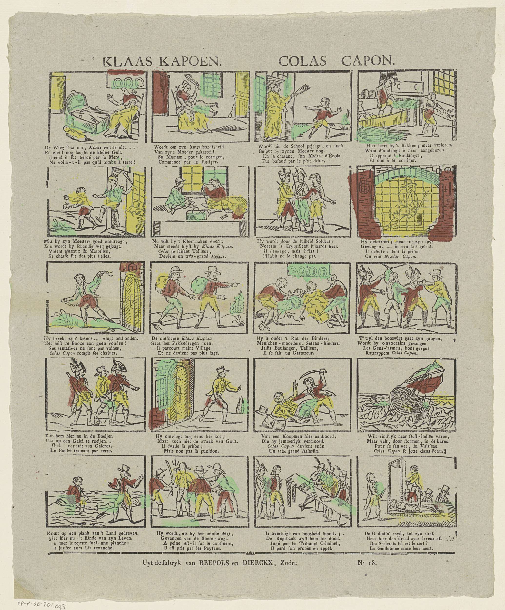 Blad met 20 voorstellingen over het leven en bezigheden van een schurk (Klaas Kapoen). Onder elke afbeelding een tweeregelig vers in het Nederlands en in het Frans. Genummerd rechtsonder: N. 18.