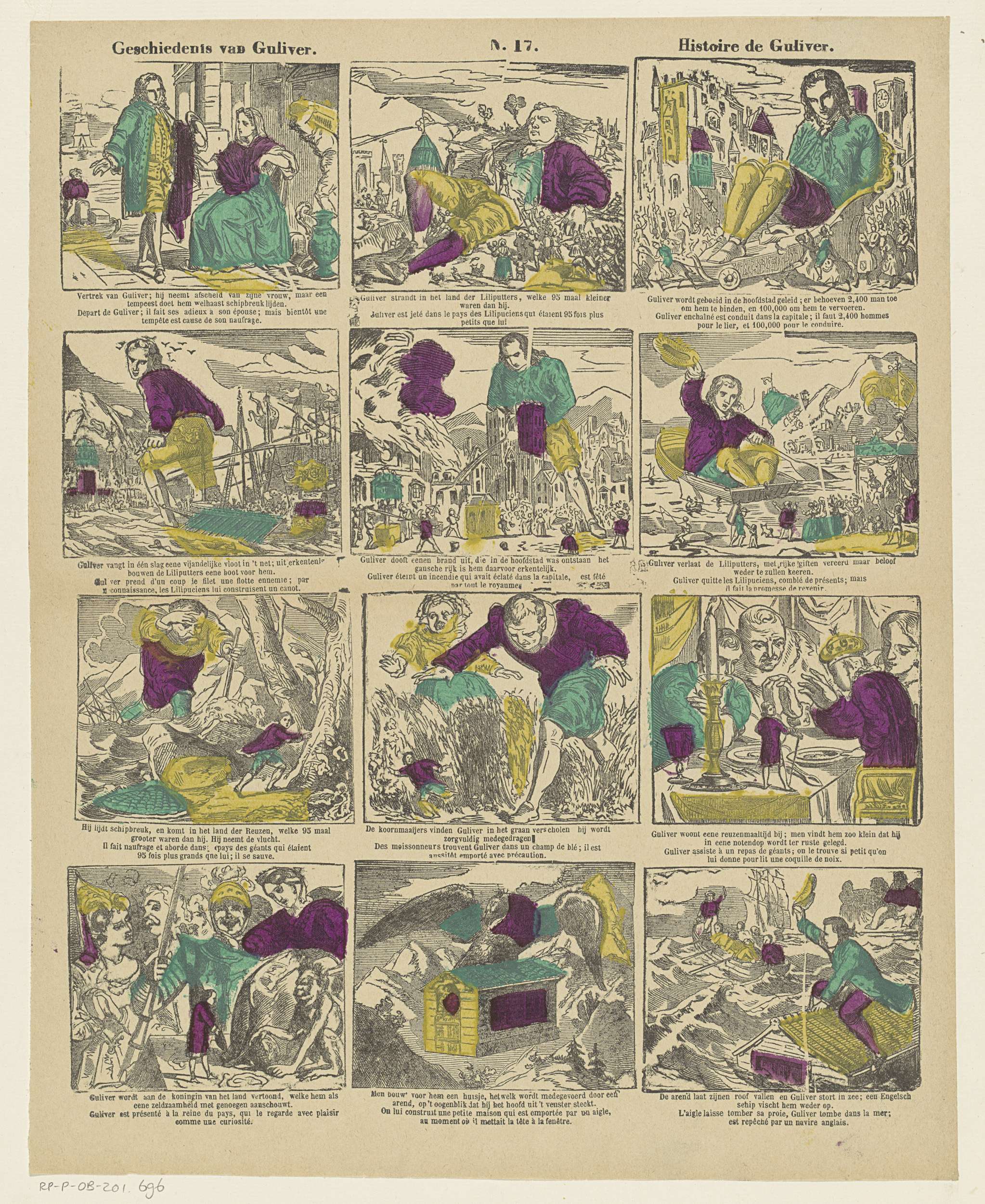 Blad met 12 voorstellingen uit Gullivers reizen, waaronder Gulliver in Lilliput en twee reuzen die Gulliver gevangennemen. Onder elke voorstelling een tweeregelig vers in het Nederlands en het Frans. Genummerd midden boven: N. 17.