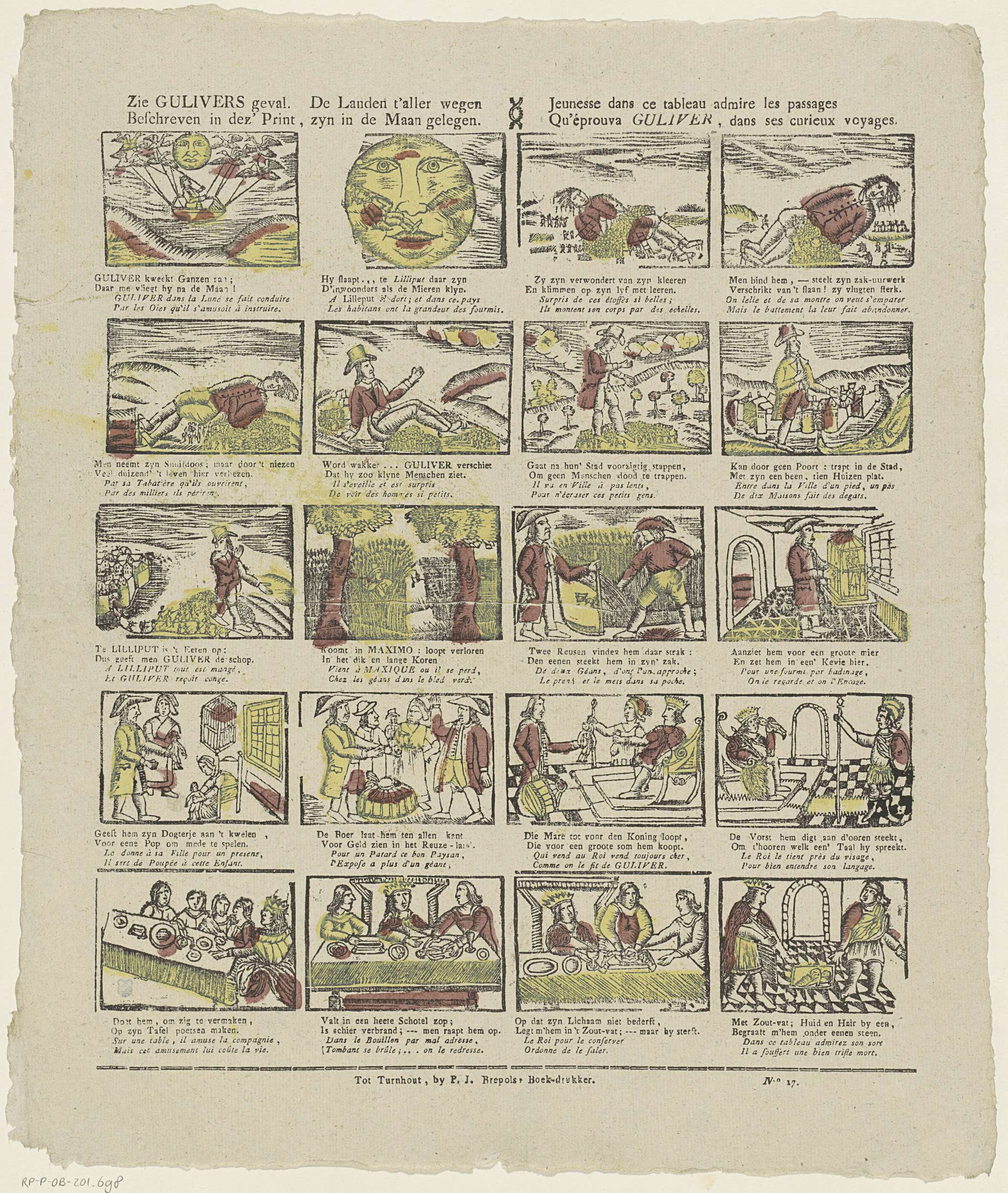 Blad met 20 voorstellingen uit Gullivers reizen, waaronder Gulliver in Lilliput en twee reuzen die Gulliver gevangennemen. Onder elke voorstelling een tweeregelig vers in het Nederlands en het Frans. Genummerd rechtsonder: No. 17.
