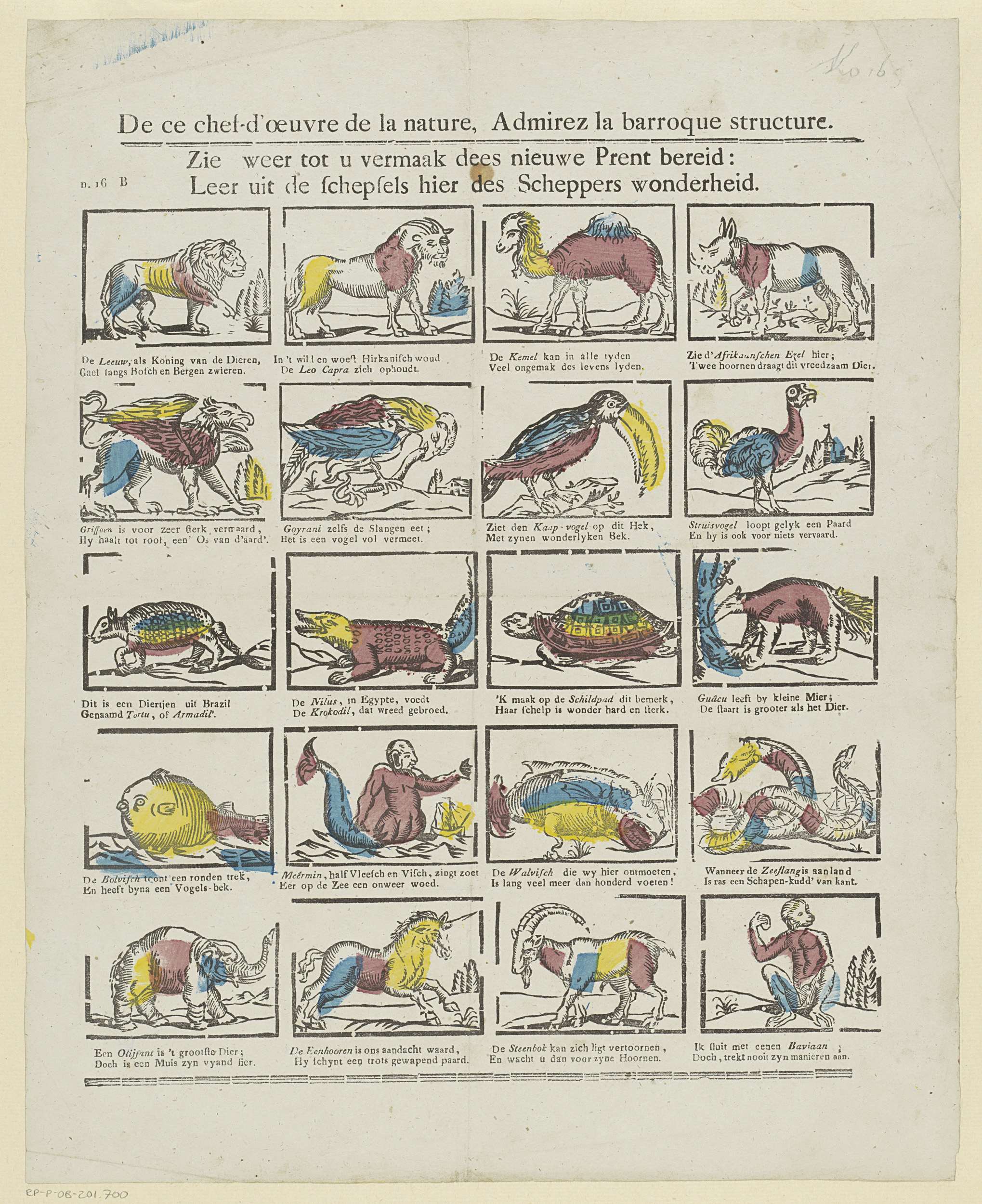 Blad met 20 voorstellingen van verschillende dieren, waaronder een leeuw, een struisvogel, een krokodil, een schildpad en een baviaan. Onder elke afbeelding een tweeregelig vers. Genummerd linksboven: n. 16 B.