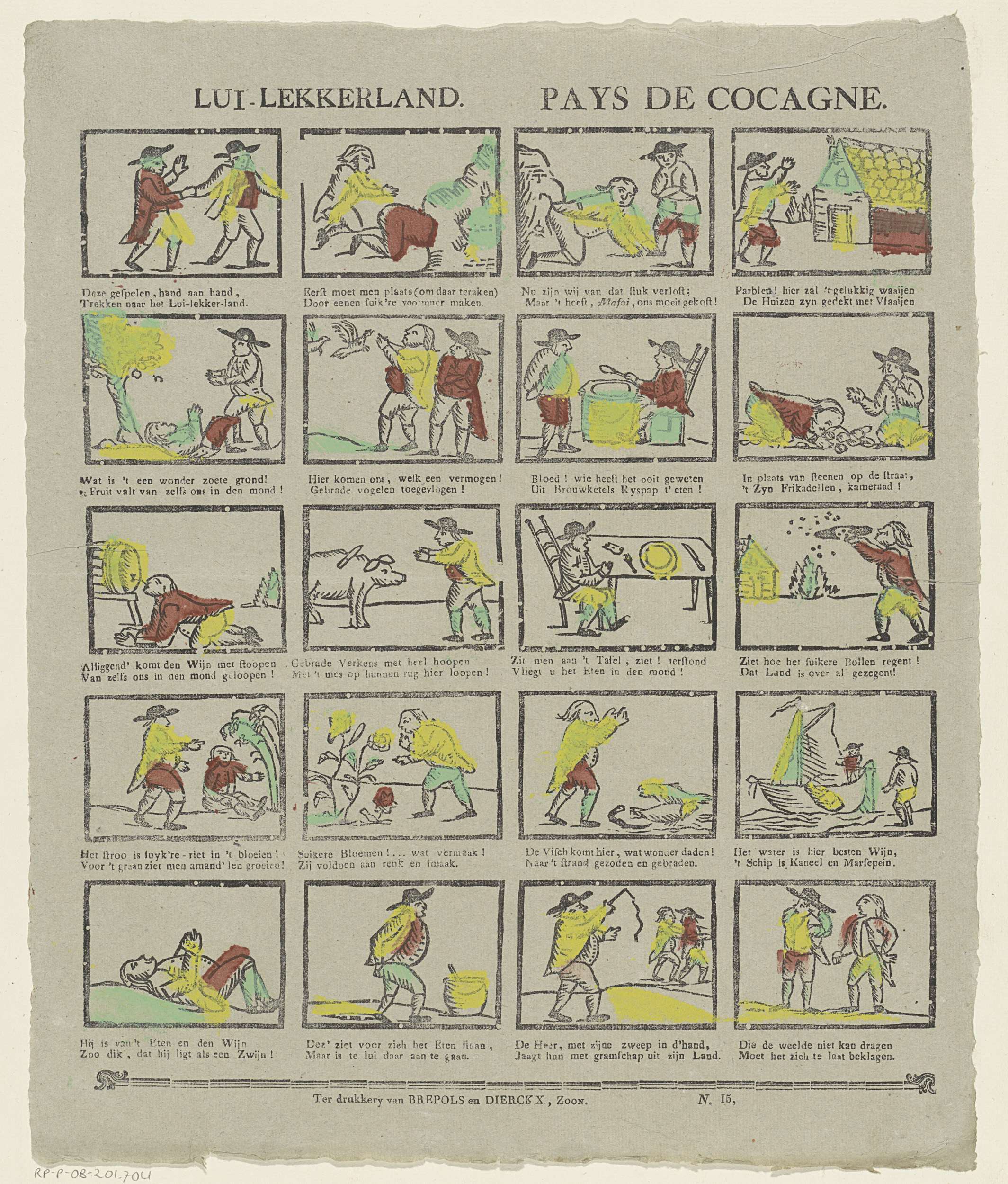Blad met 20 voorstellingen van het Luilekkerland. Onder elke afbeelding een tweeregelig vers in het Nederlands. Genummerd rechtsonder: N. 15.