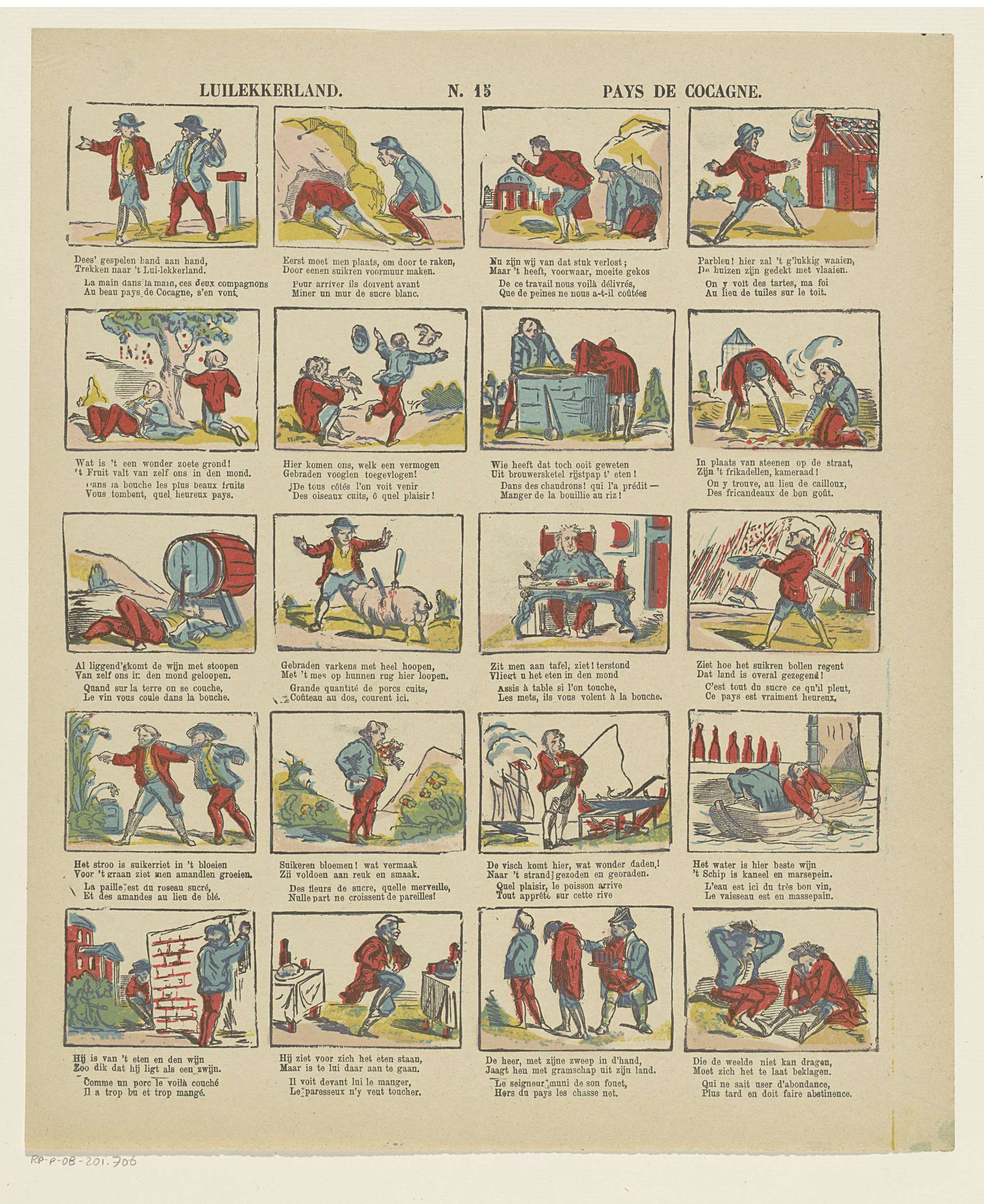 Blad met 20 voorstellingen van het Luilekkerland. Onder elke afbeelding een tweeregelig vers in het Nederlands en in het Frans. Genummerd midden boven: N. 15.