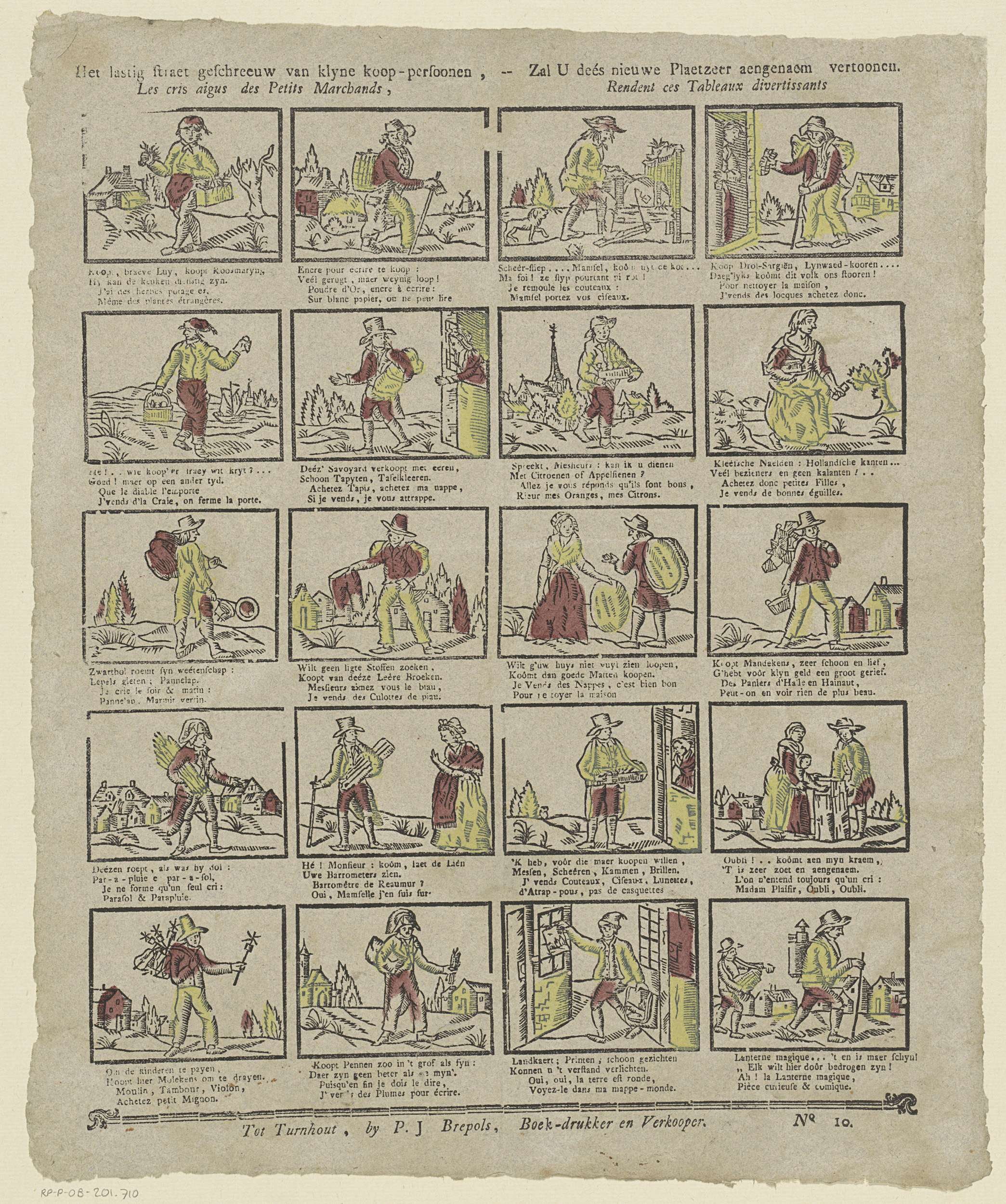 Blad met 20 voorstellingen van straatverkopers, zoals een krijtverkoper, een mattenverkoper en een prentenverkoper. Onder elke afbeelding een tweeregelig vers in het Nederlands en in het Frans. Genummerd rechtsonder: No 10.