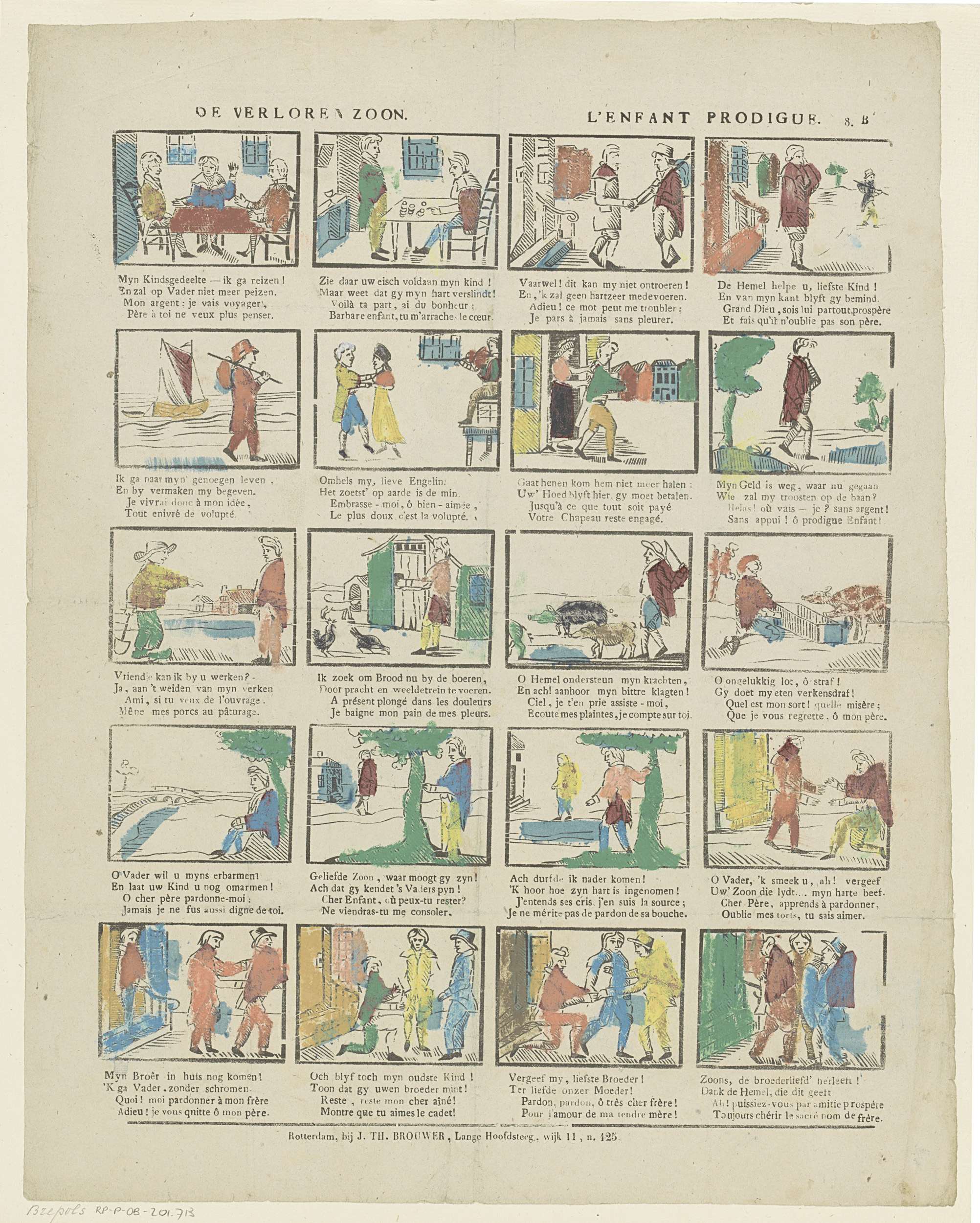 Blad met 20 voorstellingen uit het verhaal over de verloren zoon. Onder elke afbeelding een tweeregelig vers in het Nederlands en in het Frans. Genummerd rechtsboven: 8. B.