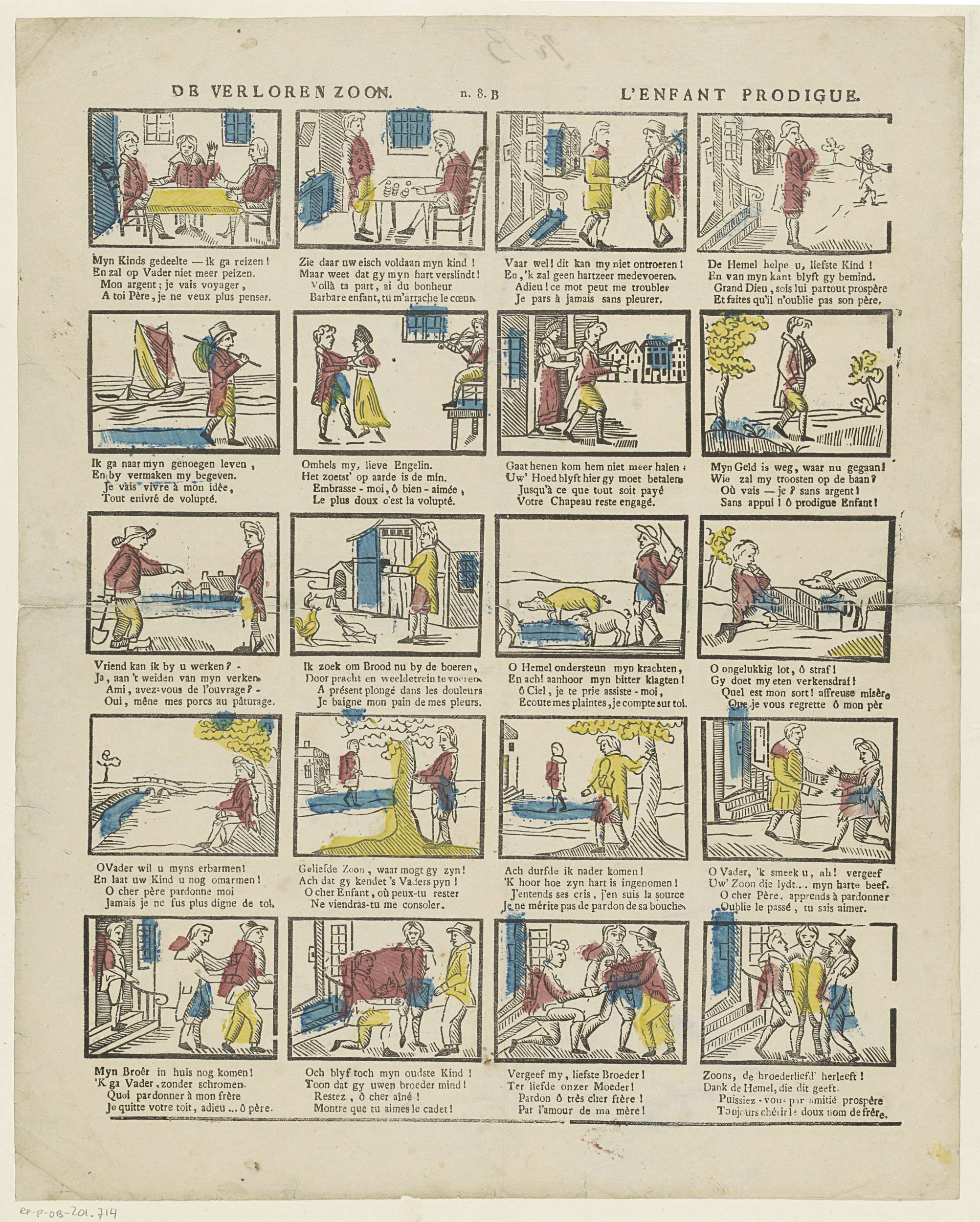 Blad met 20 voorstellingen uit het verhaal over de verloren zoon. Onder elke afbeelding een tweeregelig vers in het Nederlands en in het Frans. Genummerd midden boven: n. 8. B.