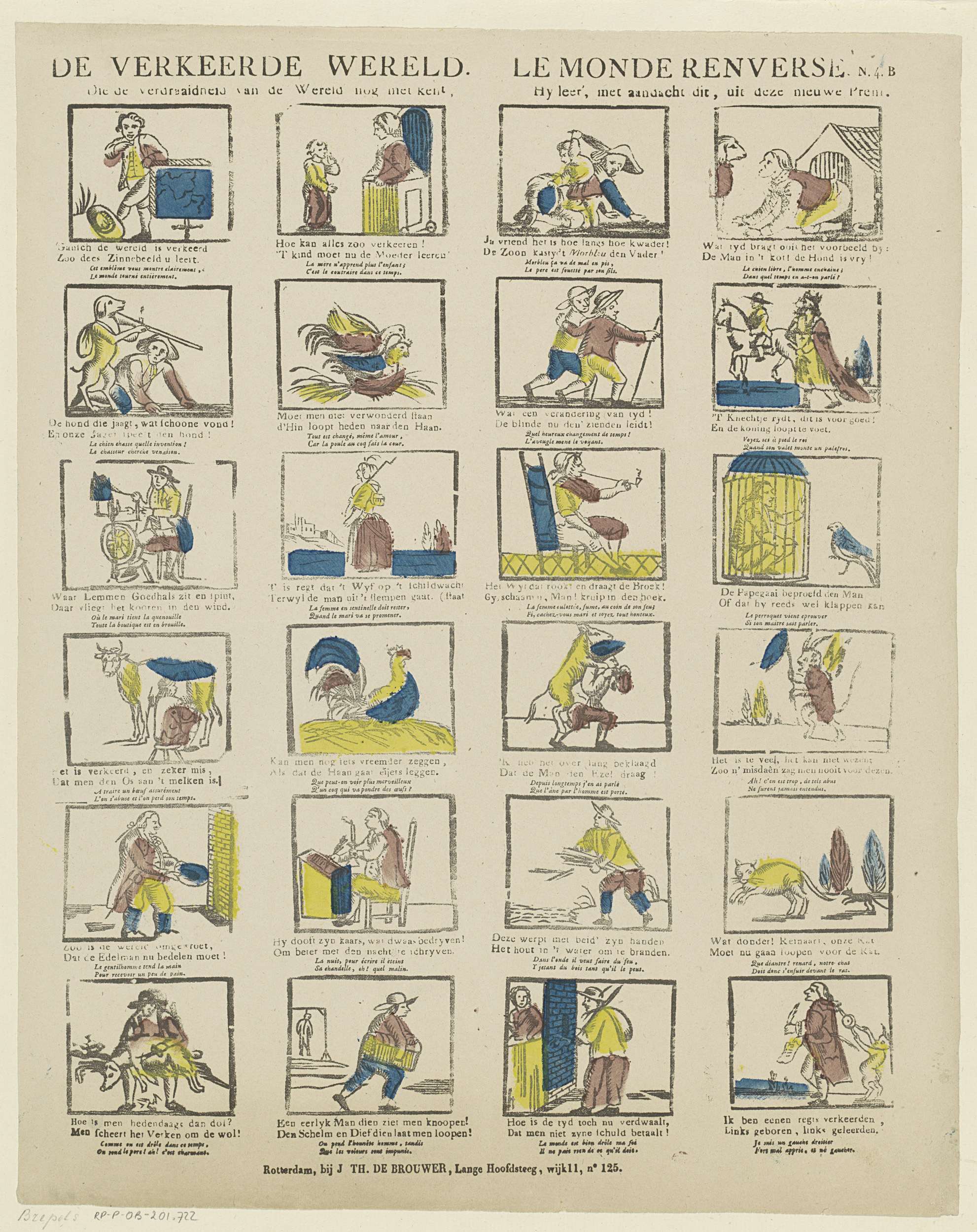 Blad met 24 voorstellingen over de verkeerde wereld, waar onder andere dieren zich als mensen gedragen. Onder elke voorstelling een tweeregelig vers in het Nederlands en in het Frans. Genummerd rechtsboven: N. 4. B.
