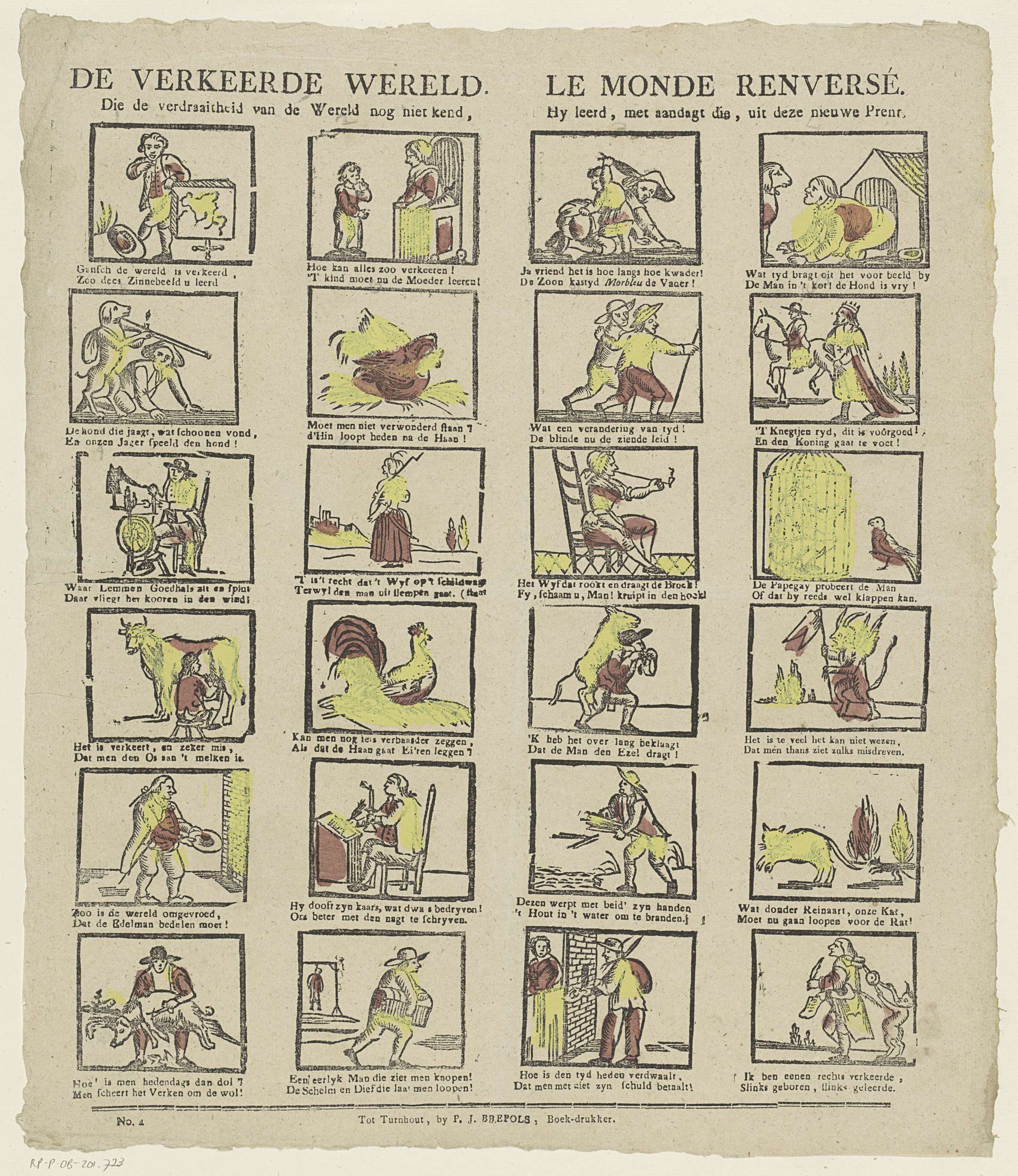 Blad met 24 voorstellingen over de verkeerde wereld, waar onder andere dieren zich als mensen gedragen. Onder elke voorstelling en de titel een tweeregelig vers in het Nederlands. Genummerd linksonder: No. 4.