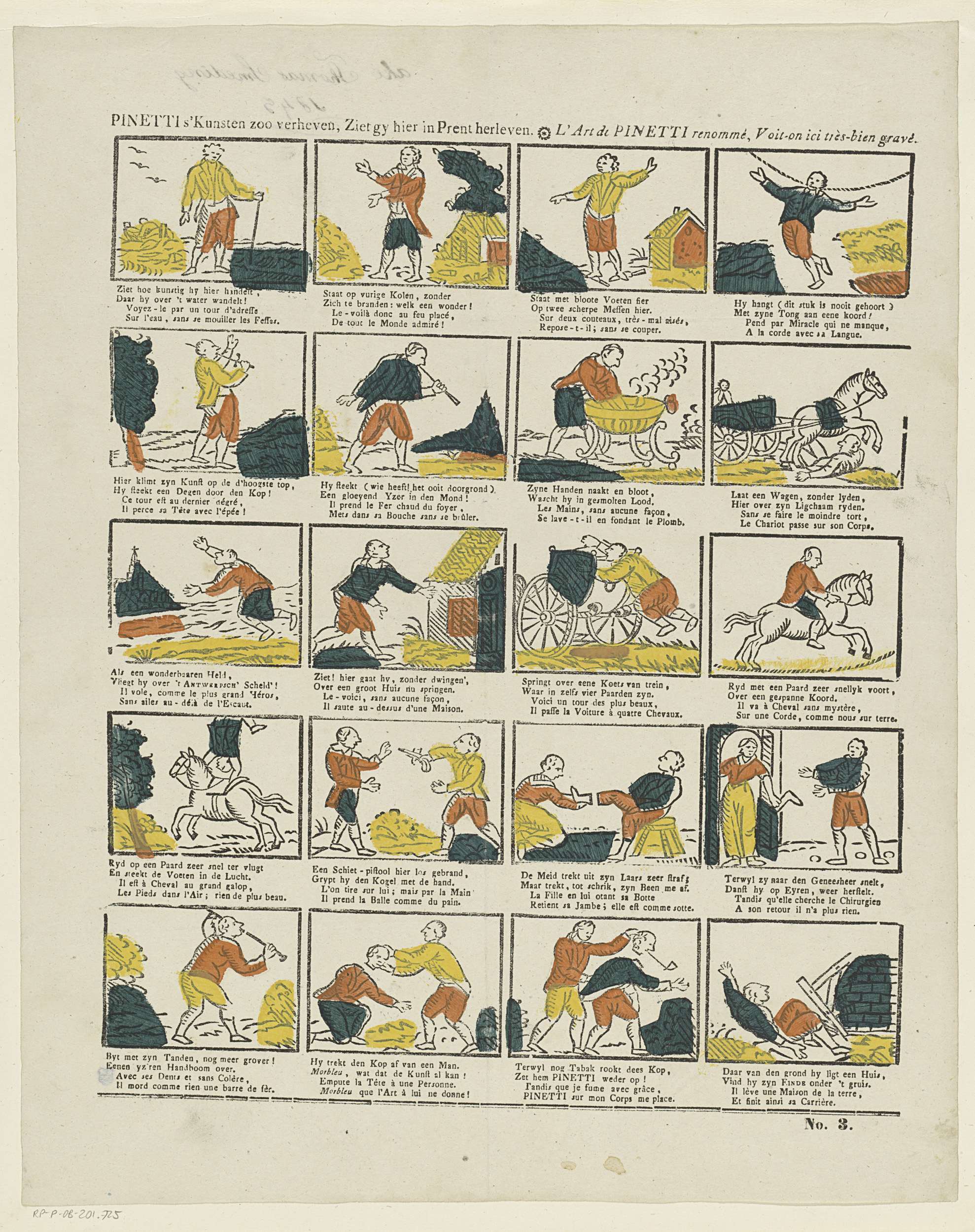 Blad met 20 voorstellingen van kunstenmakers en waaghalzen. Onder elke voorstelling een tweeregelig vers in het Nederlands en in het Frans. Genummerd rechtsonder: No. 3.