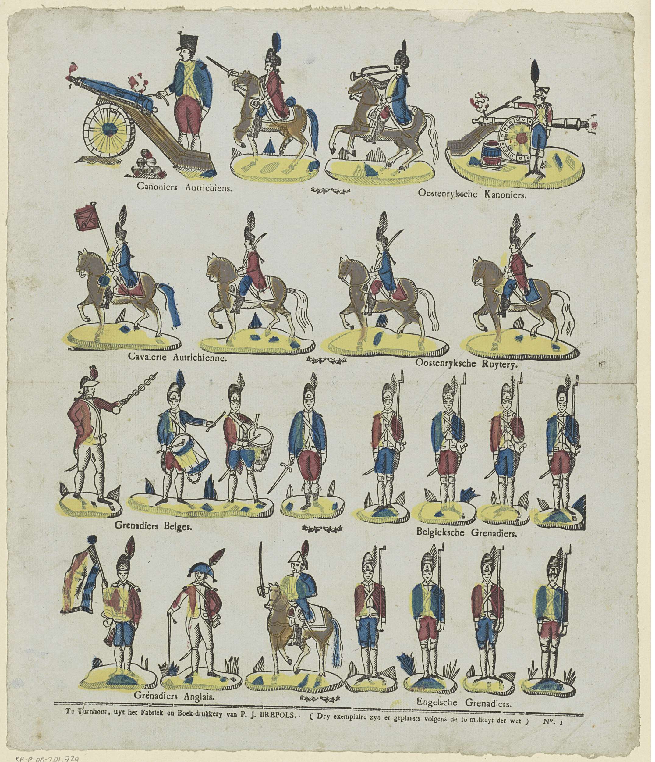 Blad met 4 horizontale rijen met met in totaal 23 militairen, te paard, met wapens en met vlaggen uit Oostenrijk, België en Engeland. Onder de voorstellingen onderschriften in het Nederlands en in het Frans. Genummerd rechtsonder: No. 1.
