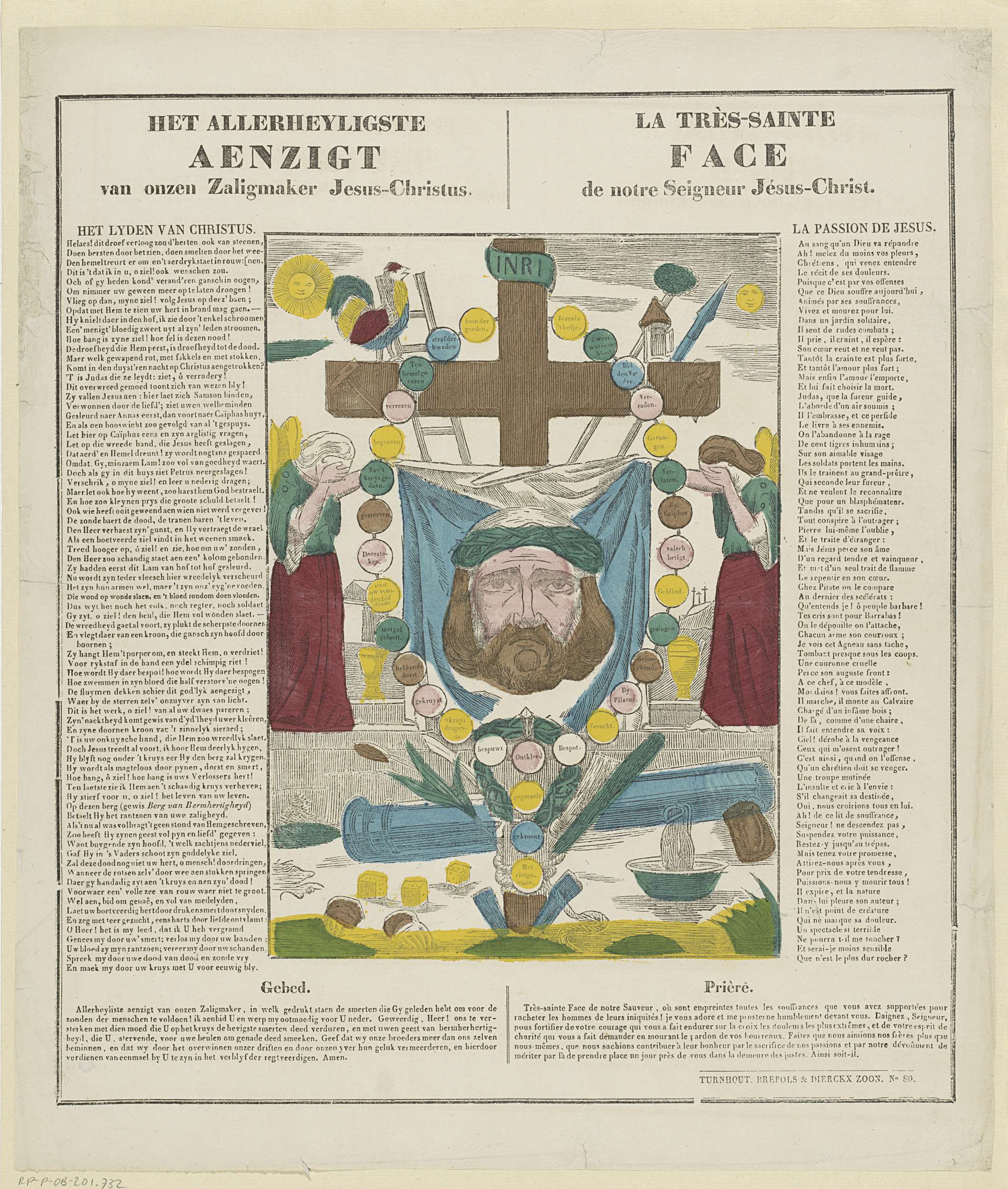 Het kruis van Christus omringd door de werktuigen van de Passie, twee treurende engelen en centraal de zweetdoek van Veronica met de beeldtenis van Christus. Rondom tekst in boekdruk in het Nederlands en in het Frans. Genummerd rechtsonder: No. 80.