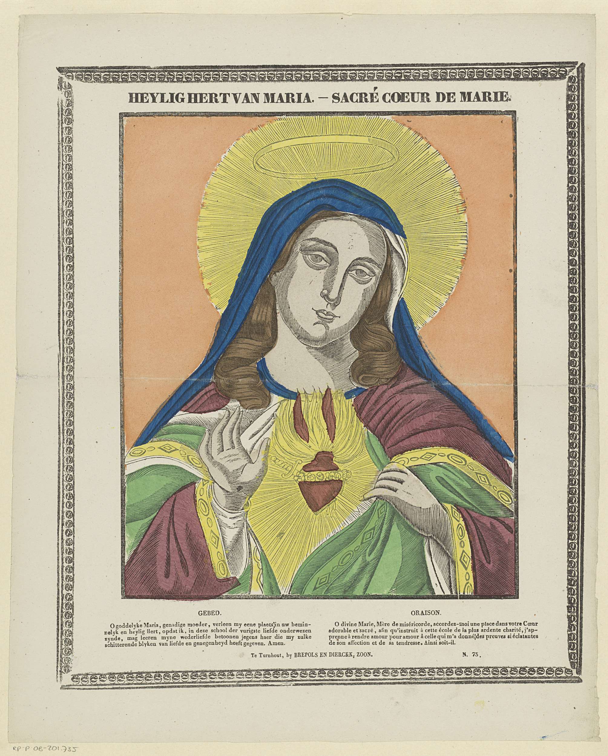 Maria met het heilige hart. Onderschrift in het Nederlands en in het Frans in twee kolommen. Geheel omgeven door sierrand. Genummerd rechtsonder: N. 73.