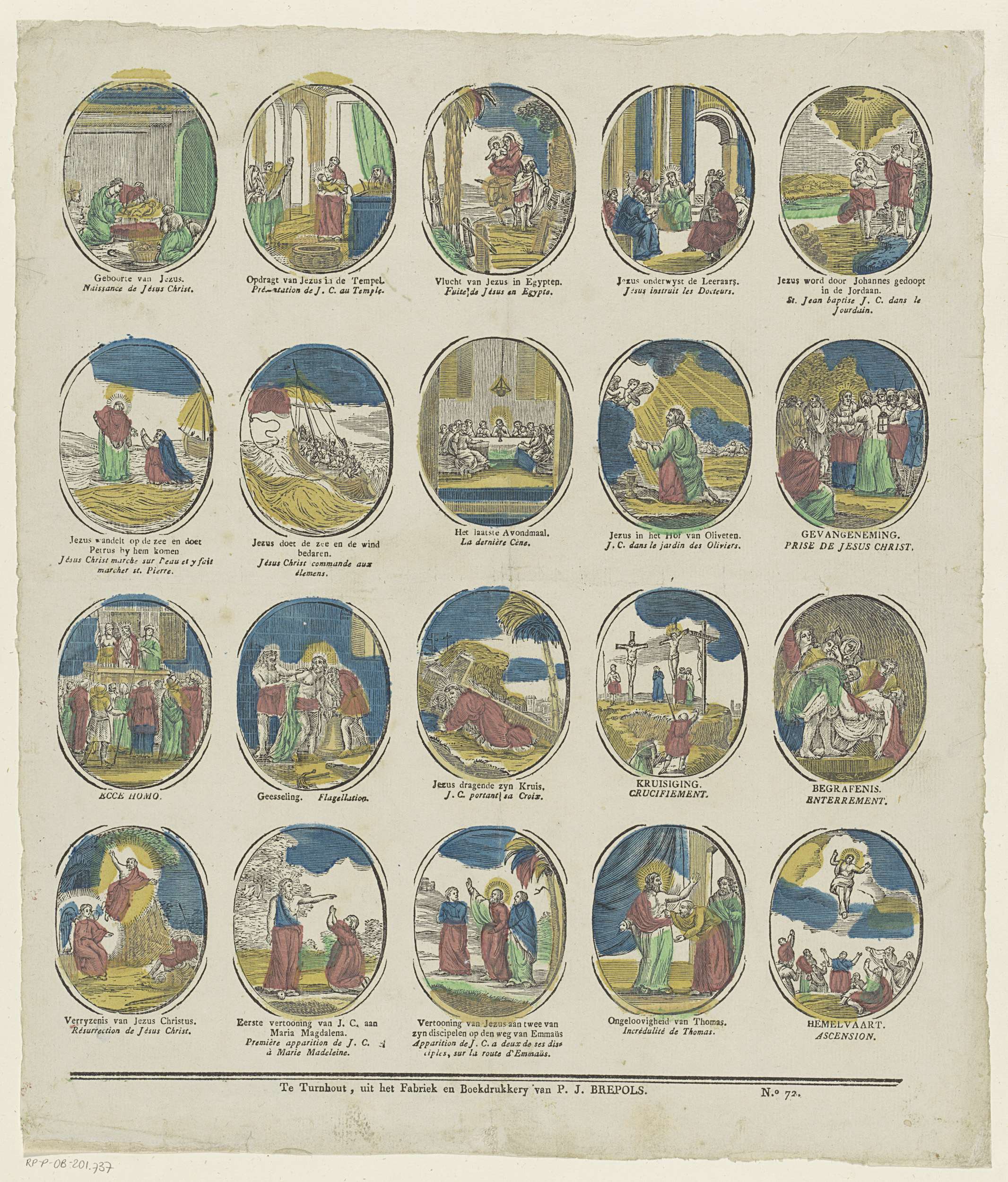 Blad met 20 ovale bidprentjes met voorstellingen uit het leven van Christus, waaronder de geboorte van Christus, het Laatste Avondmaal en de hemelvaart van Christus. Onder elke afbeelding een onderschrift in het Nederlands en in het Frans. Genummerd rechtsonder: No. 72.