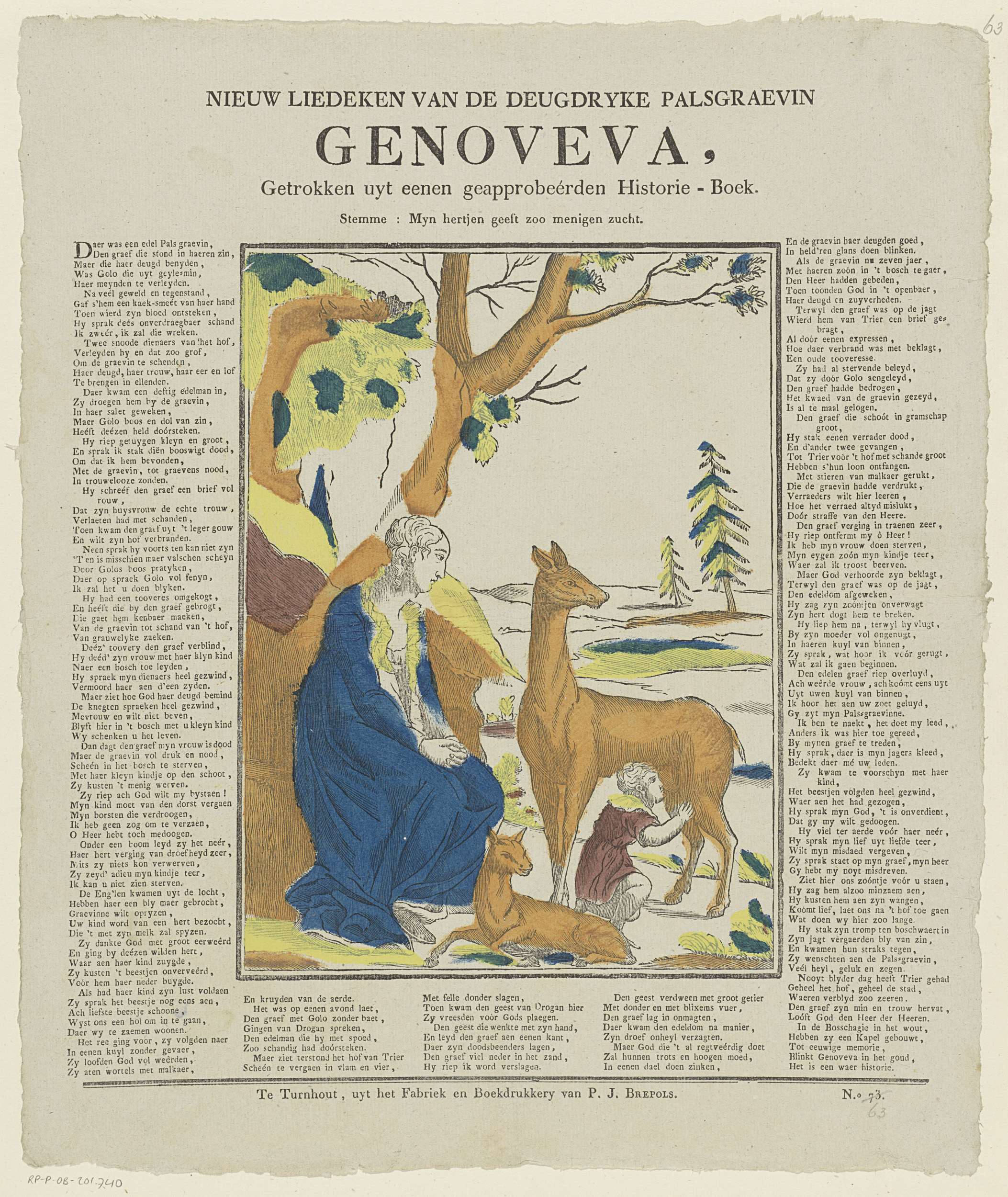 Genoveva van Brabant zittend in de wildernis met haar zoontje. Haar zoontje wordt gezoogd door een ree. Op de voorgrond ligt een jong reetje. Rondom tekst in boekdruk in het Nederlands. Genummerd rechtsonder: No. 73.