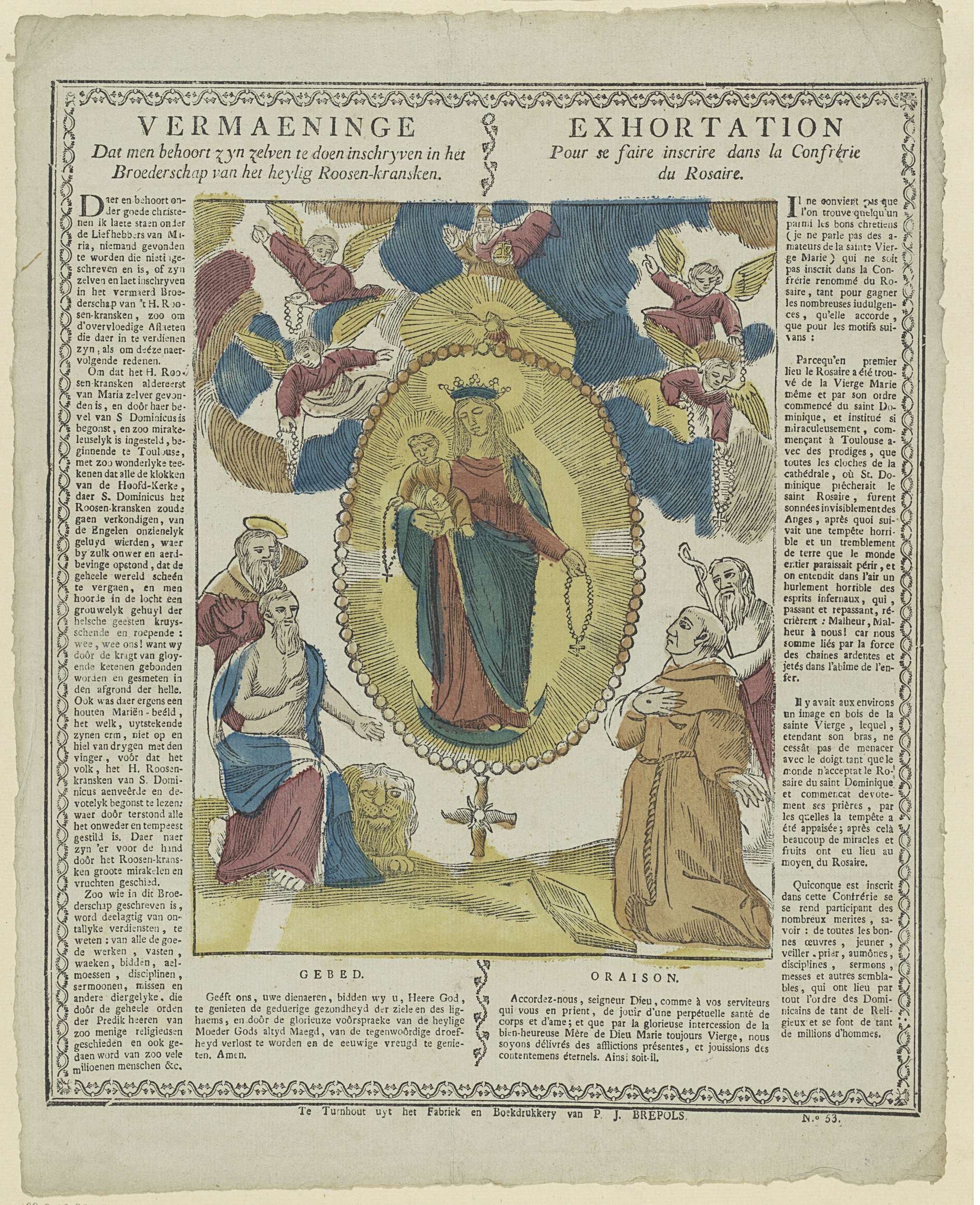 Maria en Christus met rozenkranzen in hun handen, zwevend in een grote rozenkrans, omgeven door heiligen en engelen. Rondom tekst in boekdruk in het Nederlands en in het Frans. Genummerd rechtsonder: No. 53.