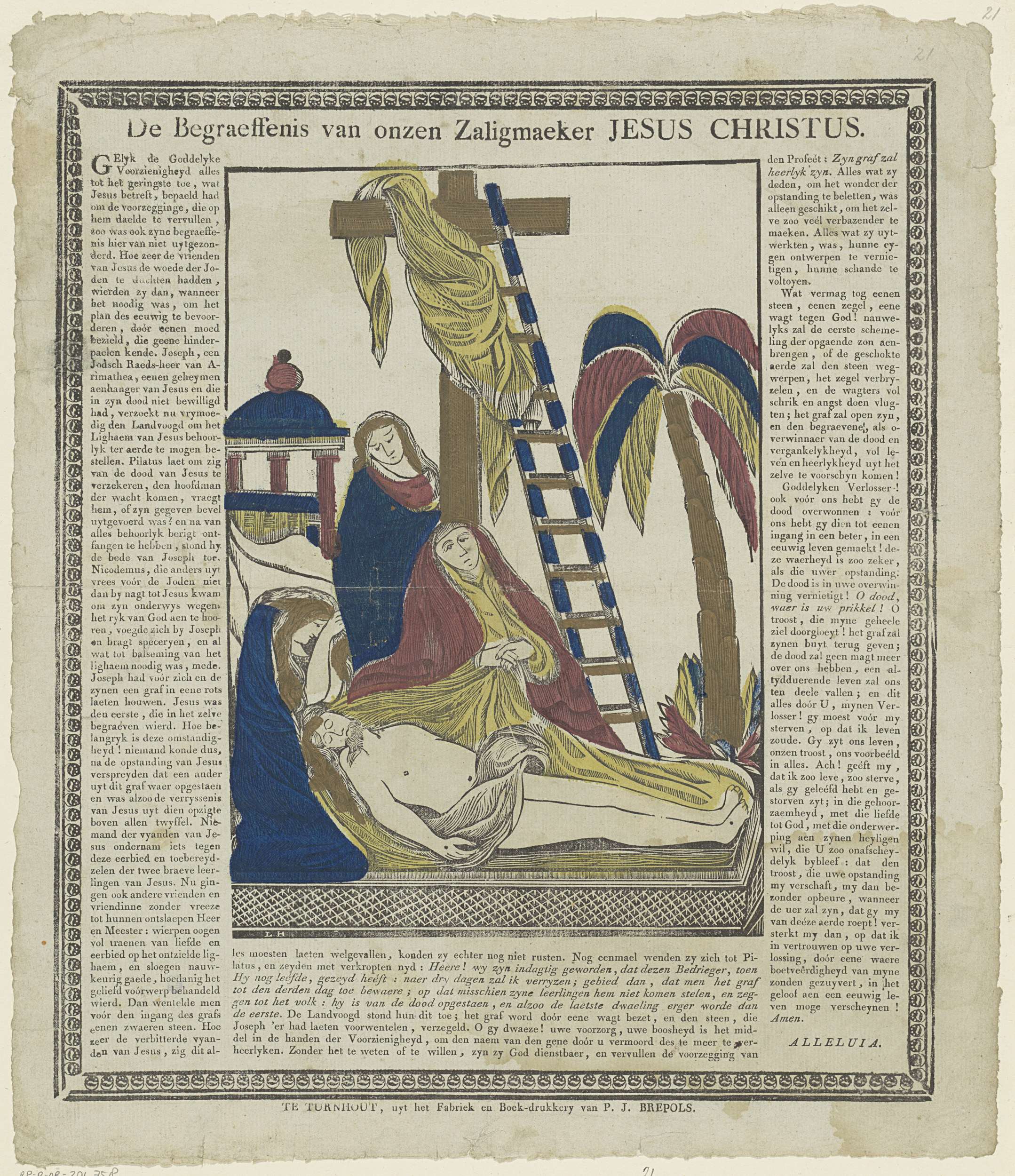 De bewening van Christus door Maria, Maria Magdalena en Johannes. Op de achtergrond het lege kruis en een ladder. Rondom tekst in boekdruk in het Nederlands. Geheel omgeven door een sierrand.