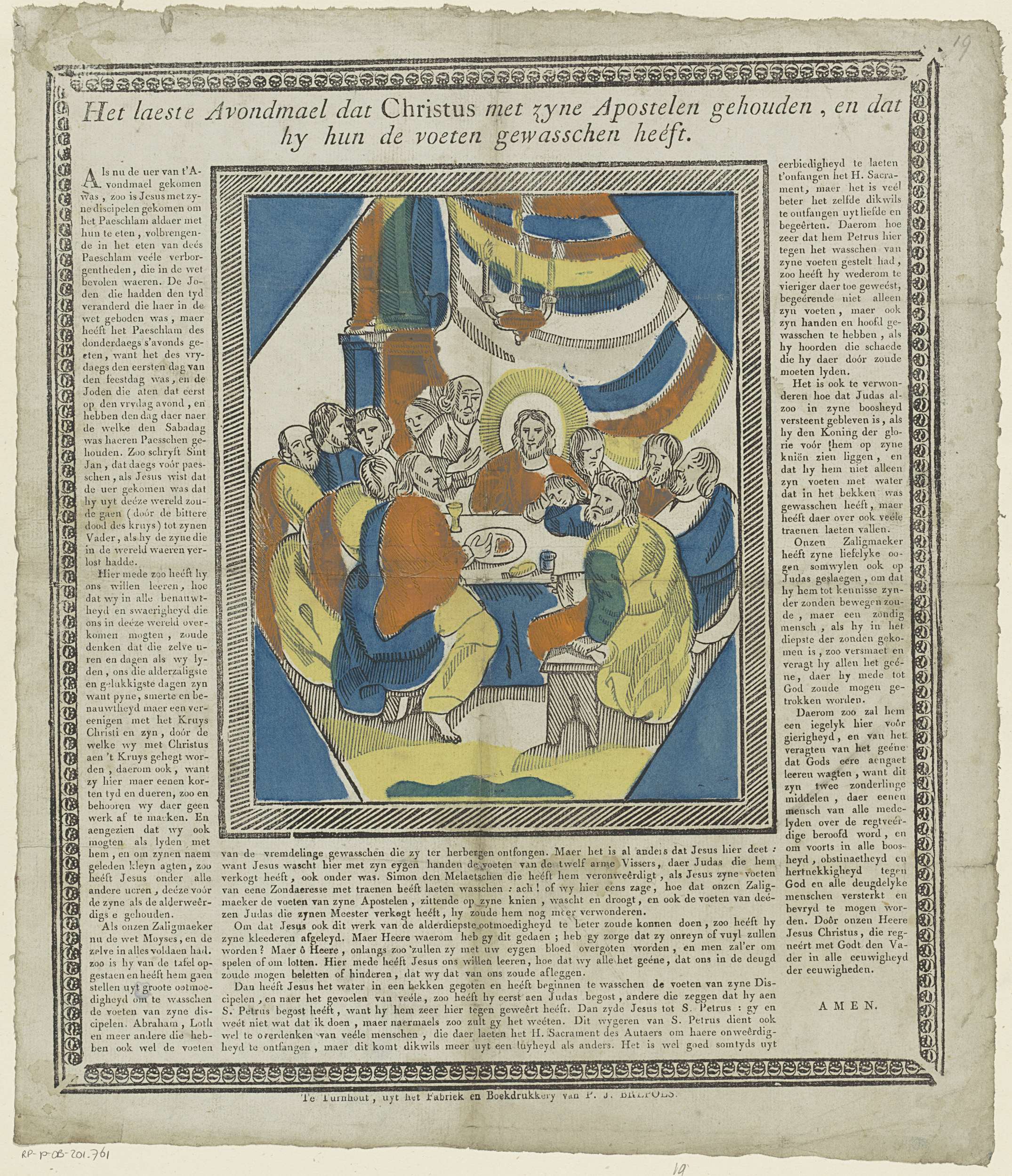 Het Laatste Avondmaal. Rondom tekst in boekdruk in het Nederlands. Geheel omgeven door een sierrand.