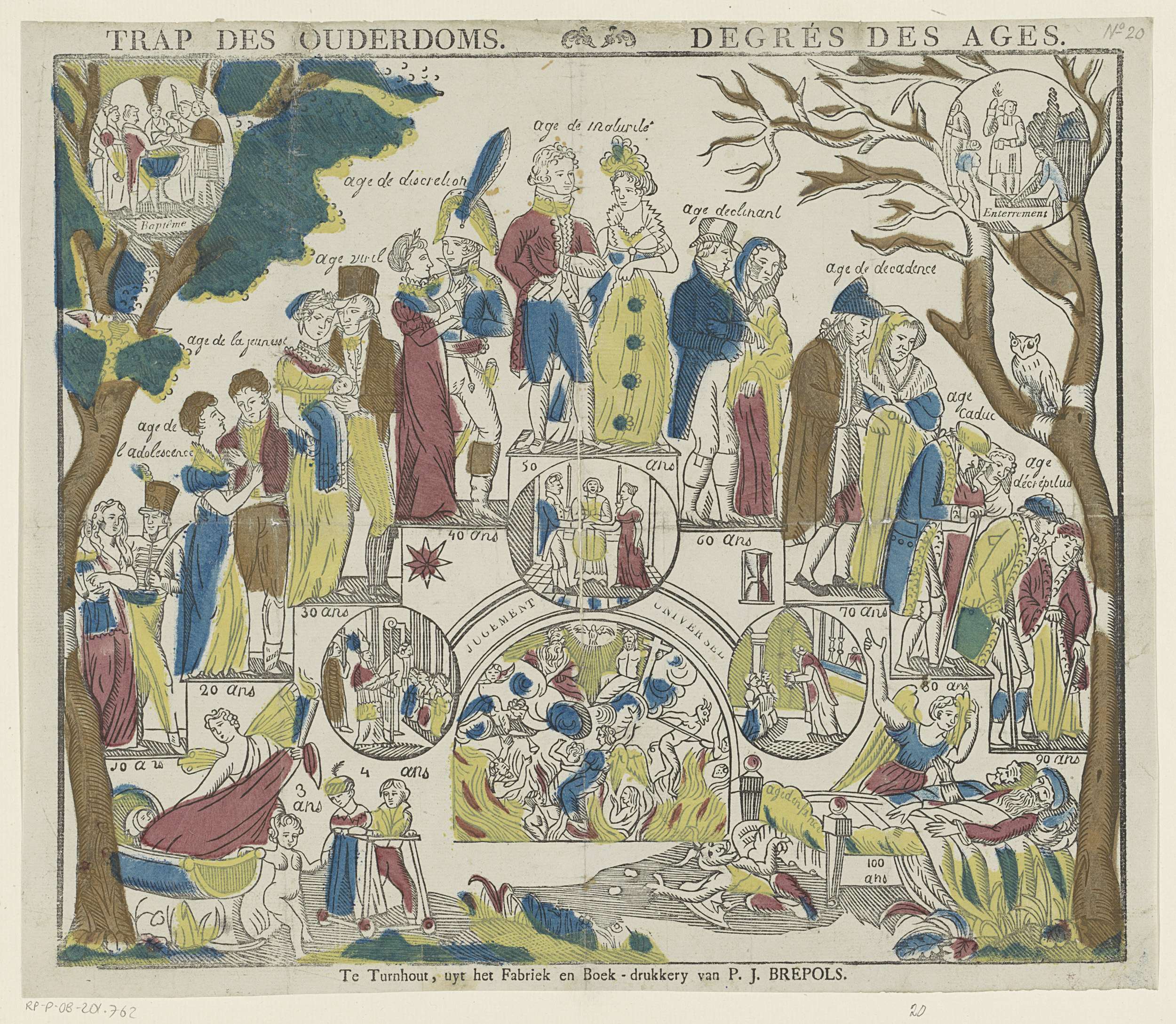 Een trap des ouderdoms: een parentrap. Op de treden van de trap, in de vorm van een brug, staan mannen en vrouwen in de leeftijd van 0 tot 100 jaar. Onder de brug een voorstelling van het Laatste Oordeel en drie kleinere voorstellingen, waaronder een voorstelling van het huwelijk, de communie en het vormsel. Links ...