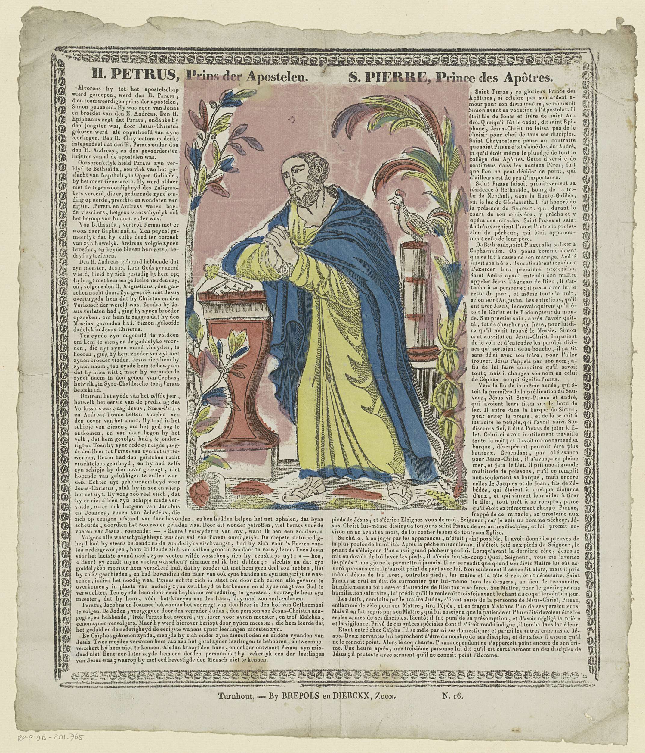 De heilige Petrus biddend met gevouwen handen bij een altaar met daarop twee sleutels. Achter met een haan op een zuil. Rondom tekst in boekdruk in het Nederlands en in het Frans. Geheel omgeven door een sierrand. Genummerd rechtsonder: N. 16.