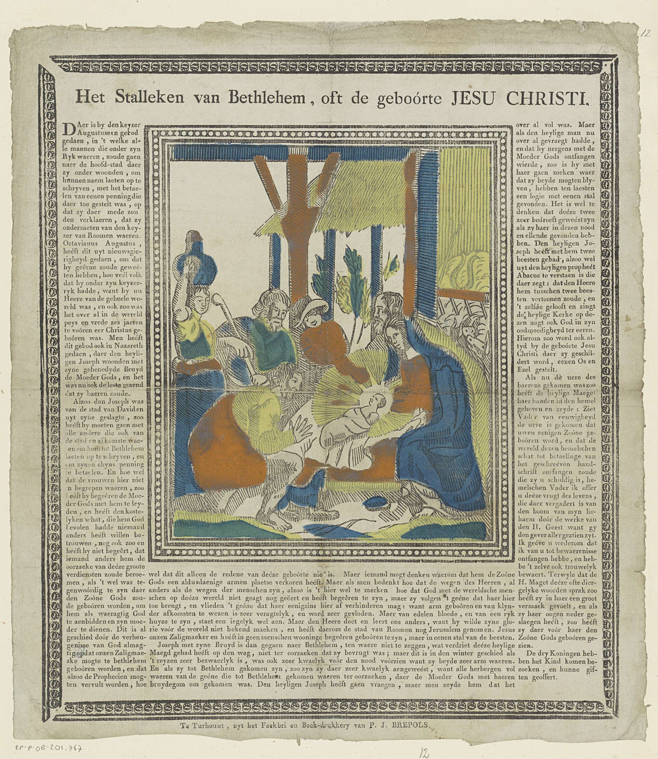 De aanbidding door de herders. Links een vrouw met een kruik op haar hoofd. Rondom tekst in boekdruk in het Nederlands. Geheel omgeven door een sierrand.