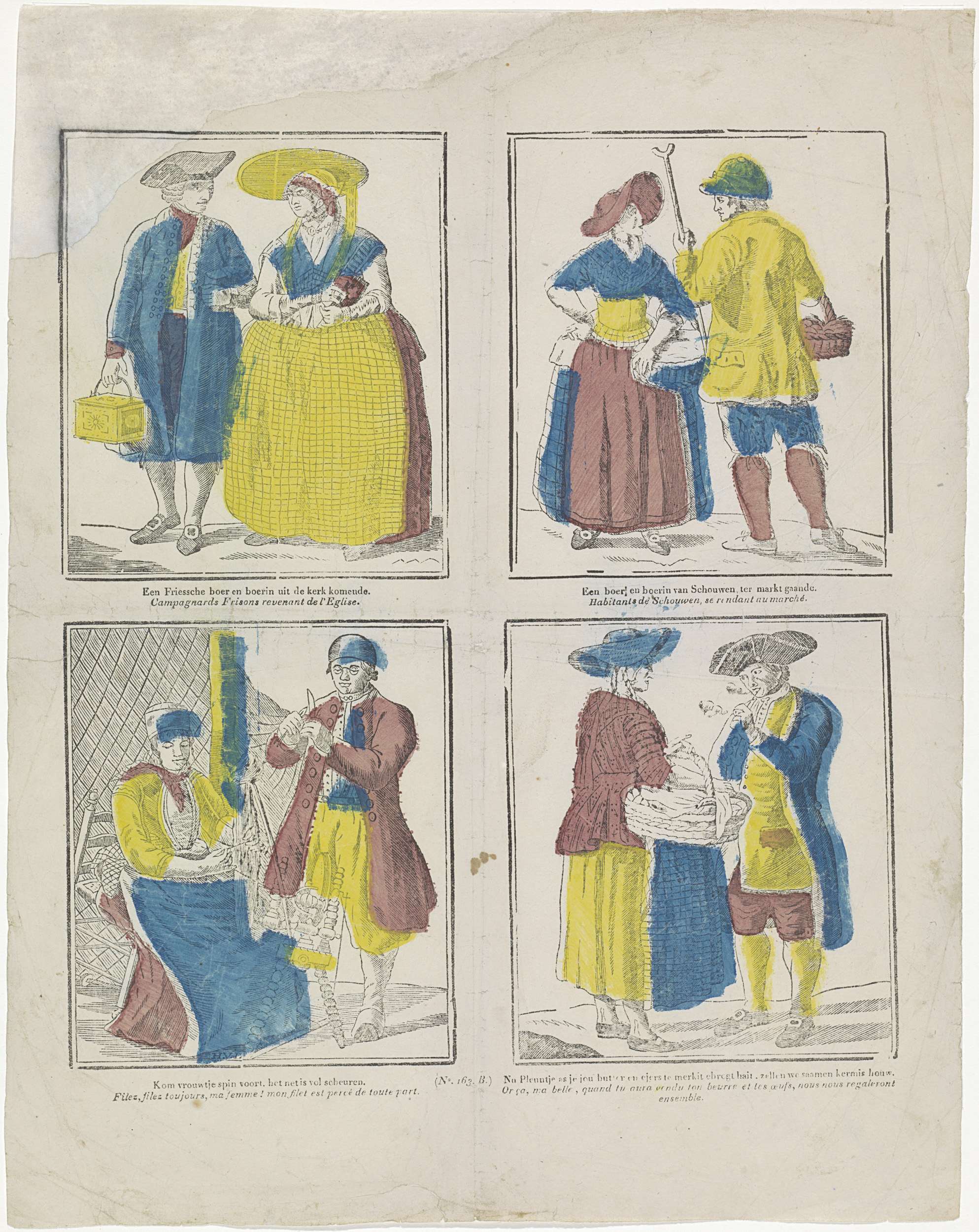 Blad met 4 voorstellingen van paren in Nederlandse klederdracht. Onder elke afbeelding een onderschrift in het Nederlands en in het Frans. Genummerd middenonder: (No. 163. B.).